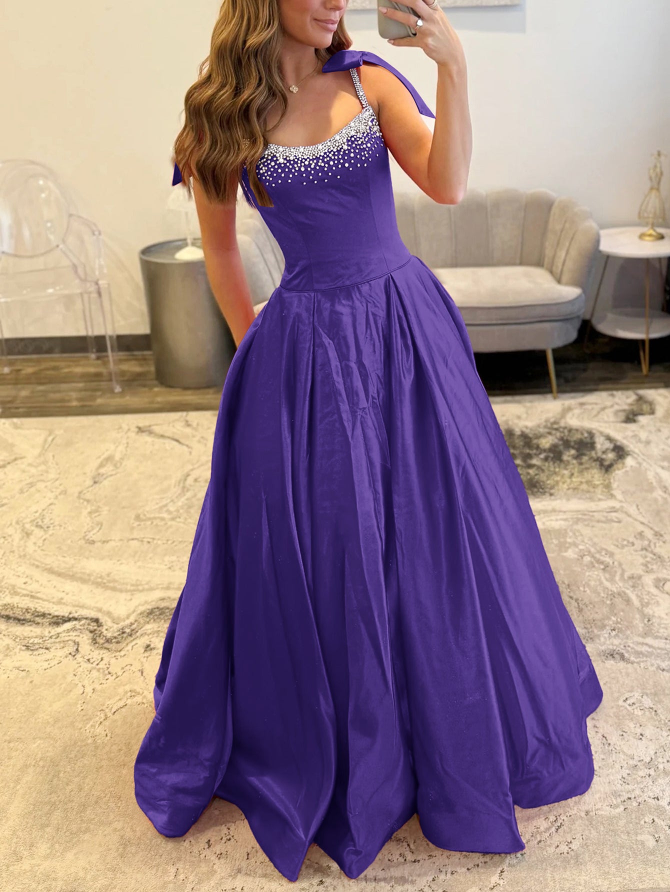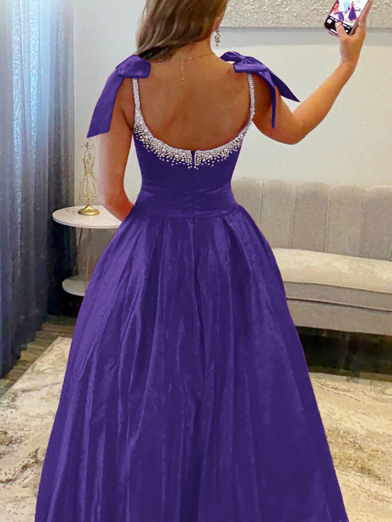 This satin prom gown features hand-beading with bows on the bodice. The long evening dress has a scoop neckline and ball gown hem. This formal dress is ideal for party, evening or festivals.