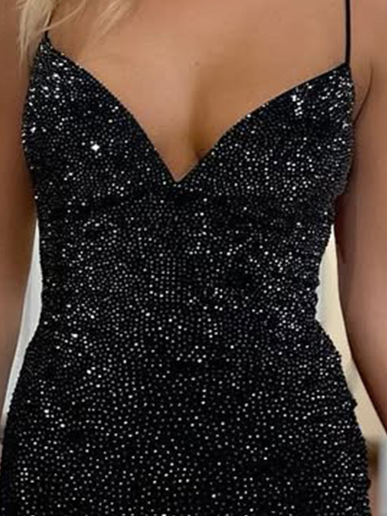 V Neck Sparkly Crystal Sheath Satin Mini Prom Dress - Black