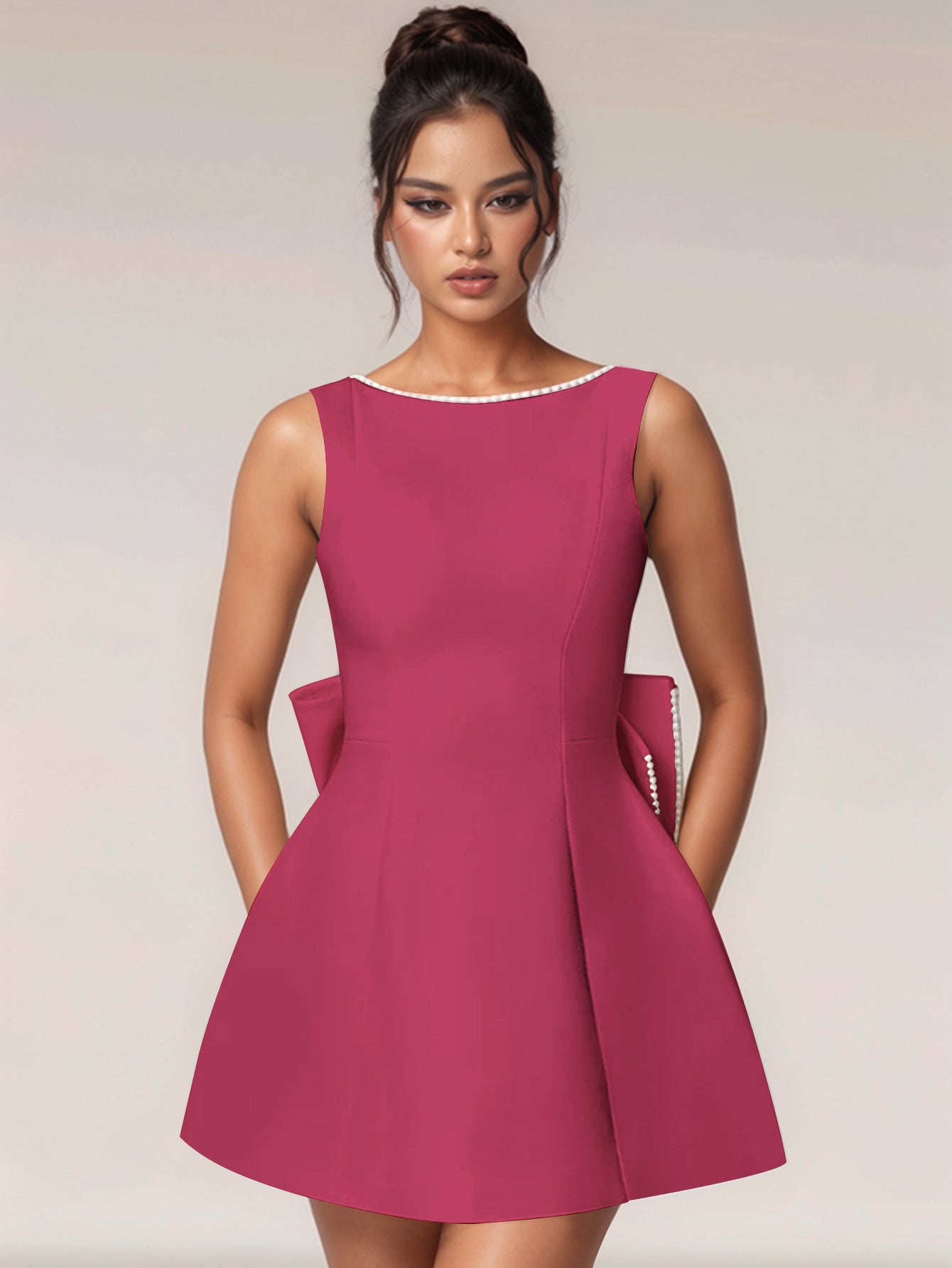 Hand Beading Backless Bow Ball Gown Prom Bridal Mini Dress - Hot Pink