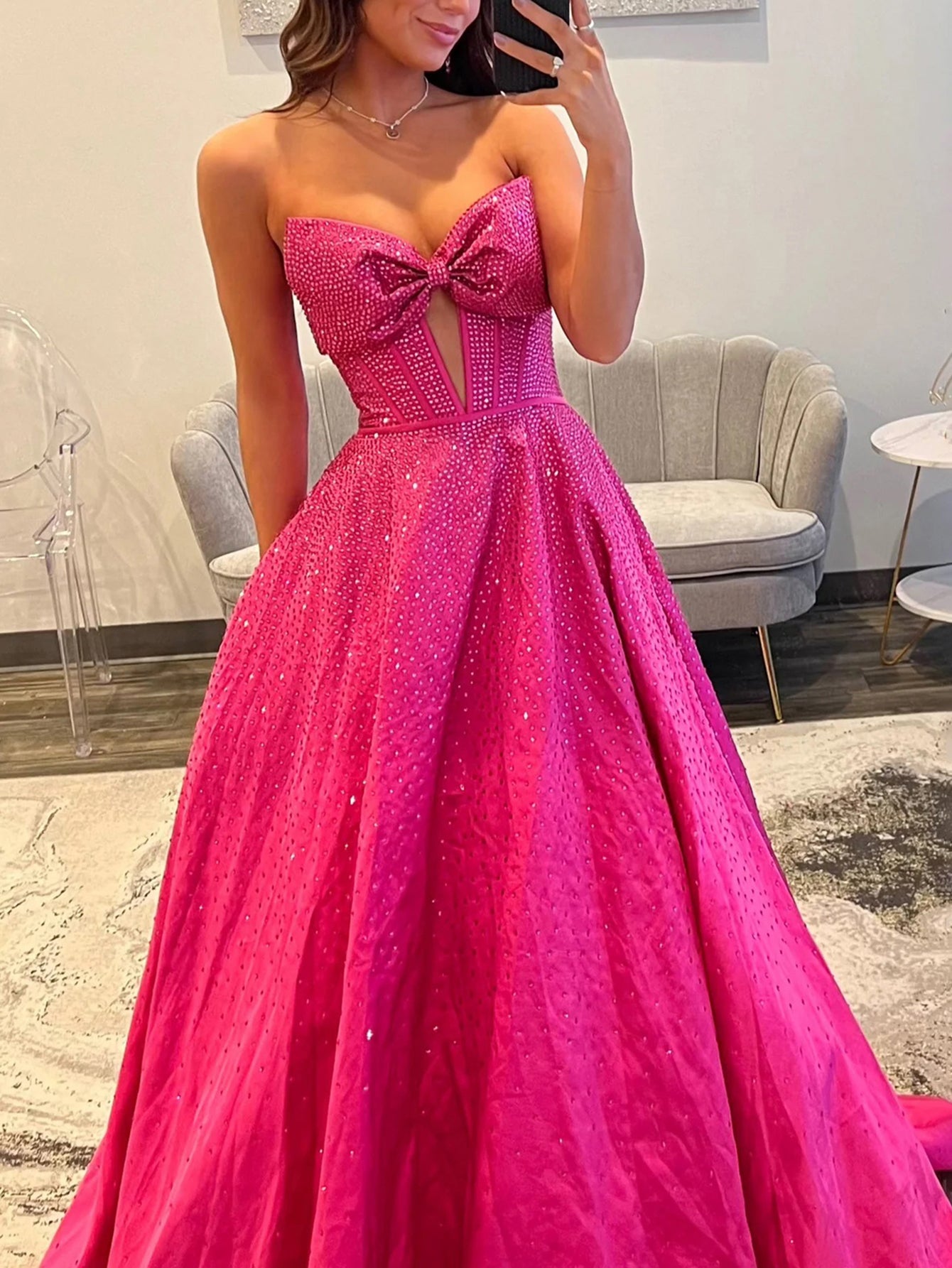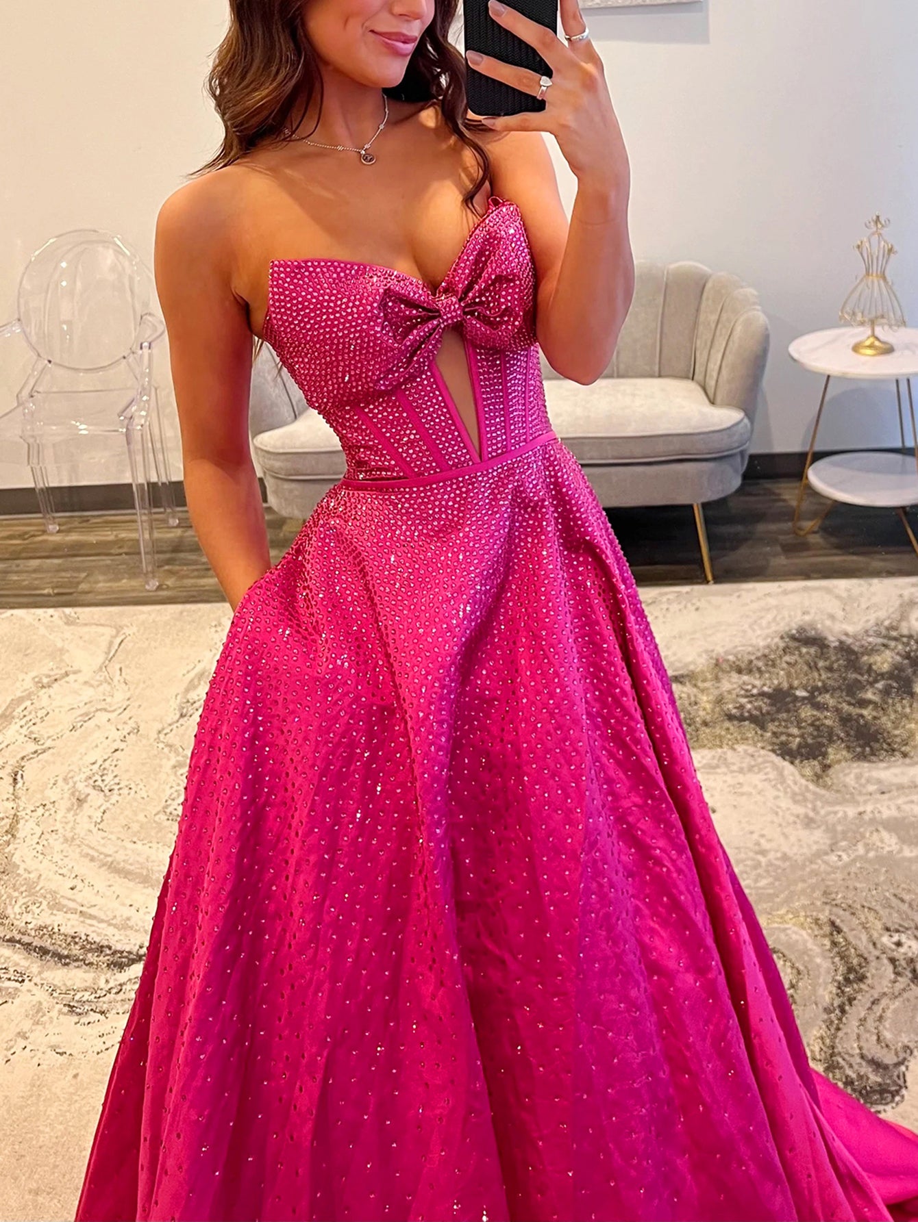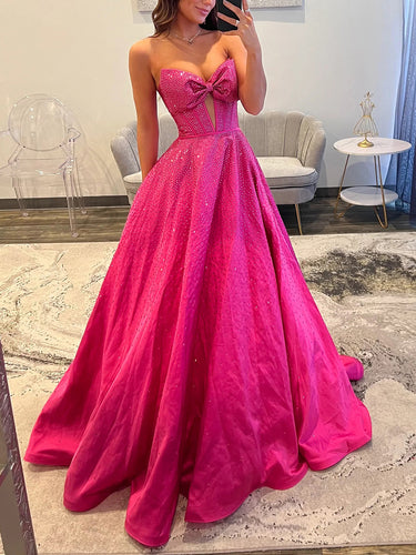 Bow Cut Front Bodice Crystal Ball Gown Prom Dress With Pockets - Hot Pink