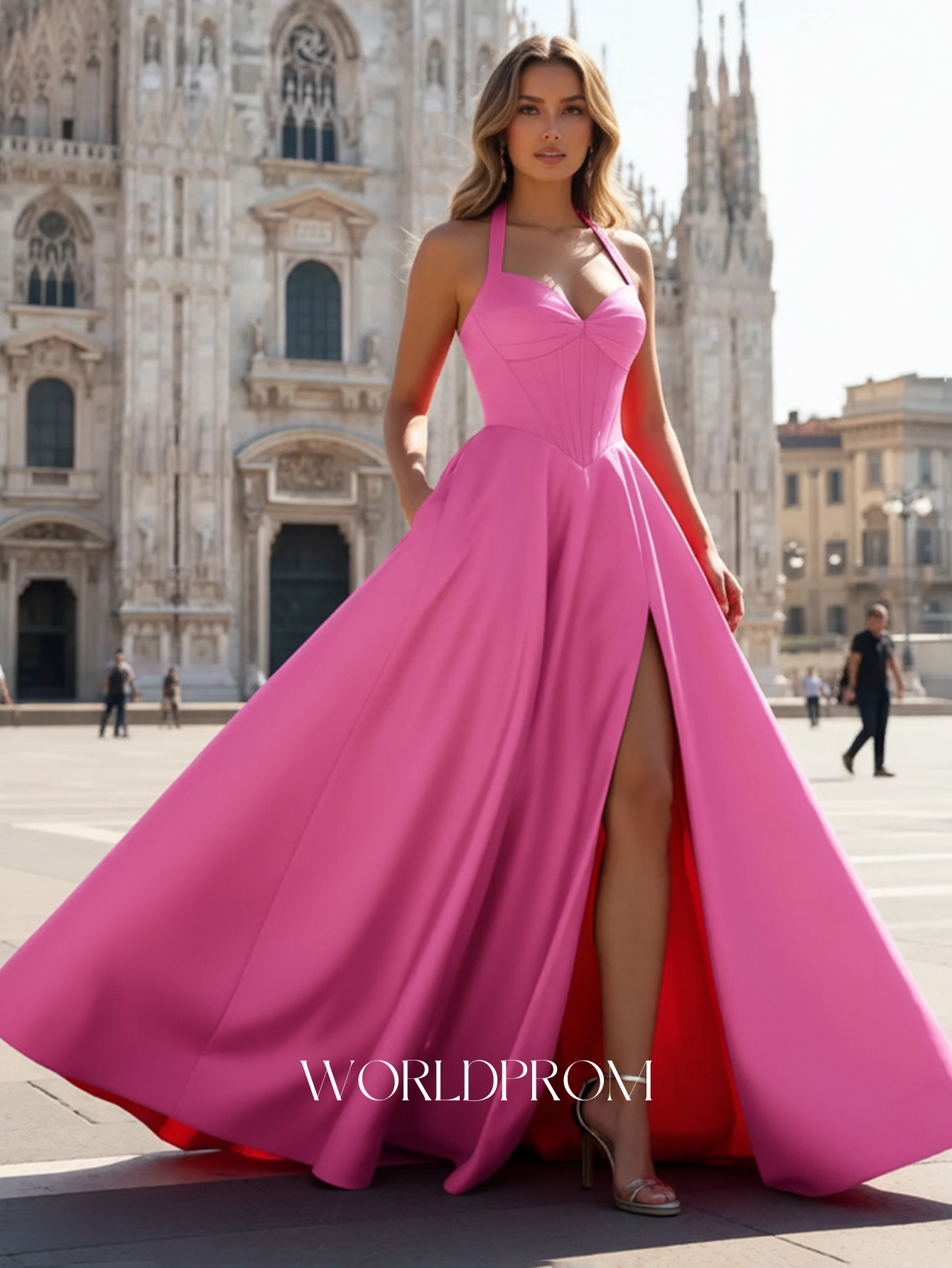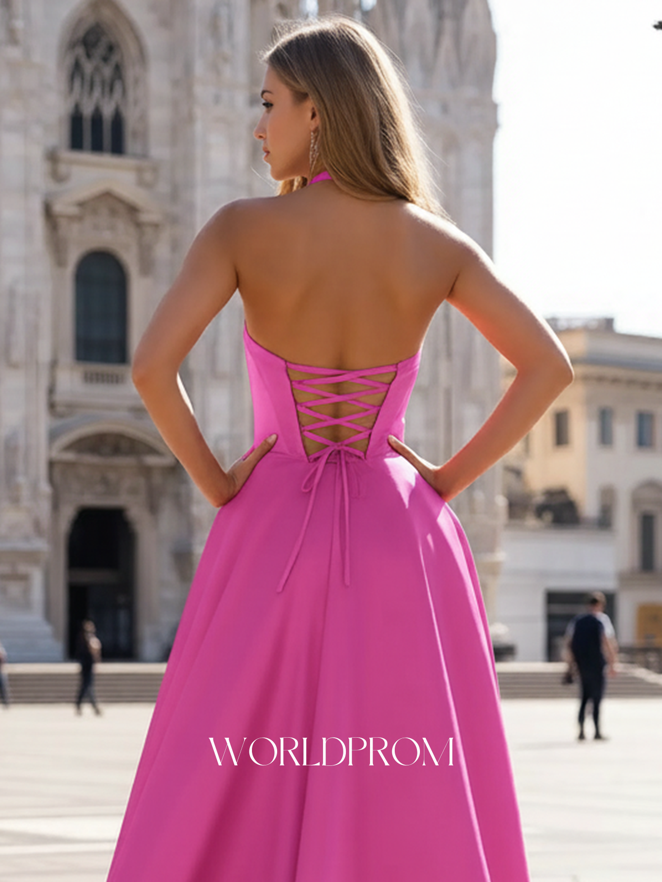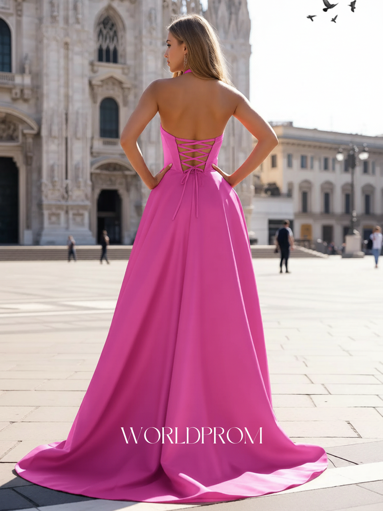 This satin prom gown features ruched bust with pockets on the bodice. The halter backless dress has a V-neckline and pleated split hem. Worldprom a-line prom dresses are ideal for party, evening or festivals.