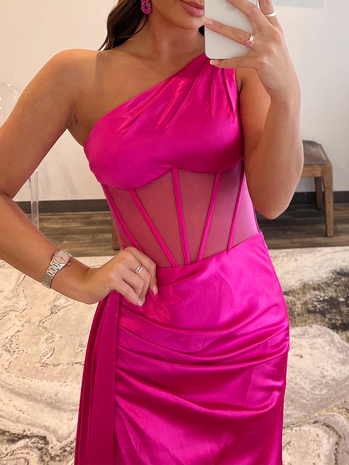One Shoulder Boned Prom Dress With Waist Drop - Hot Pink