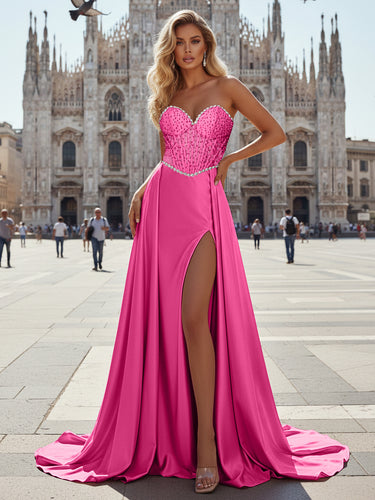 This satin prom gown features sparkly beading with drop on the bodice. The strapless dress has a sweetheart neck and split hem. Worldprom mermaid prom dresses are ideal for party, evening or festivals.