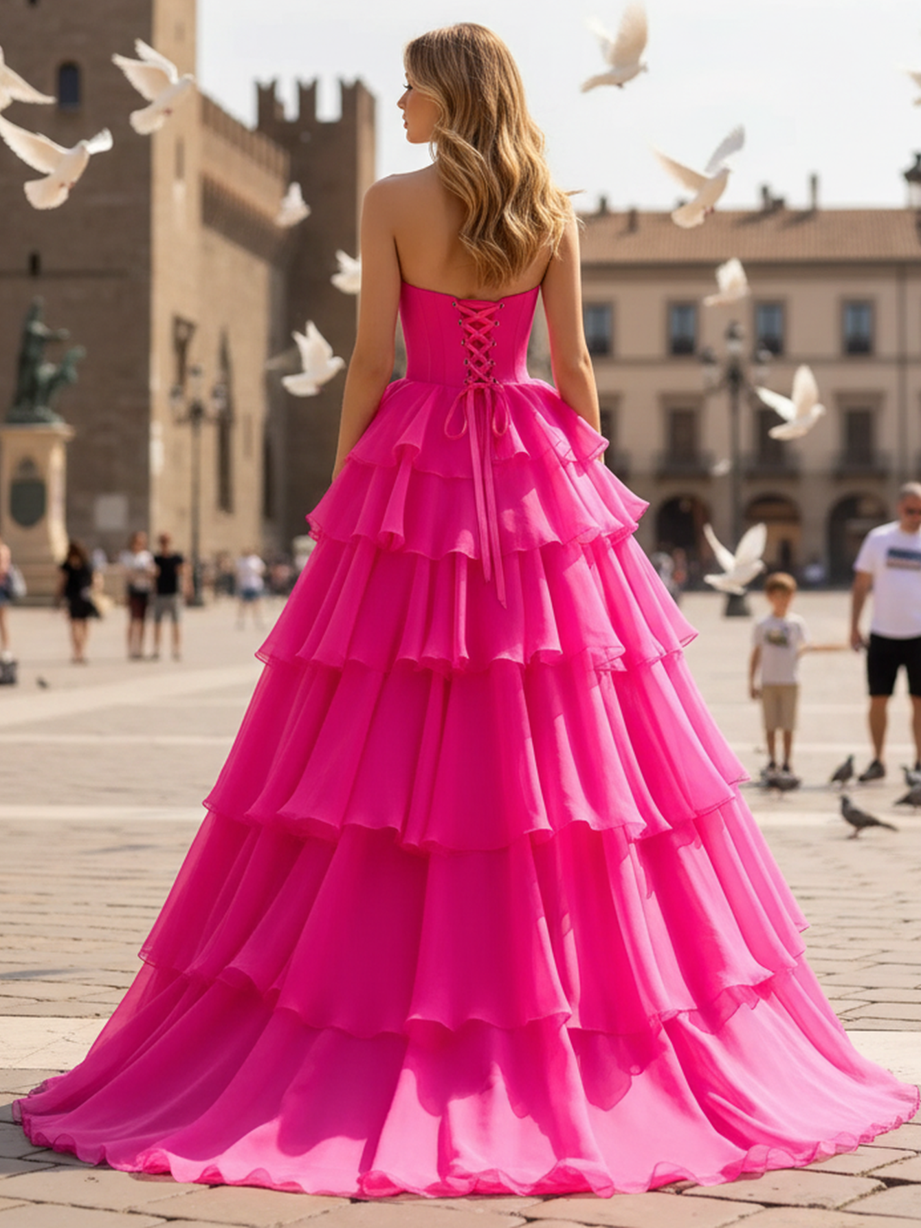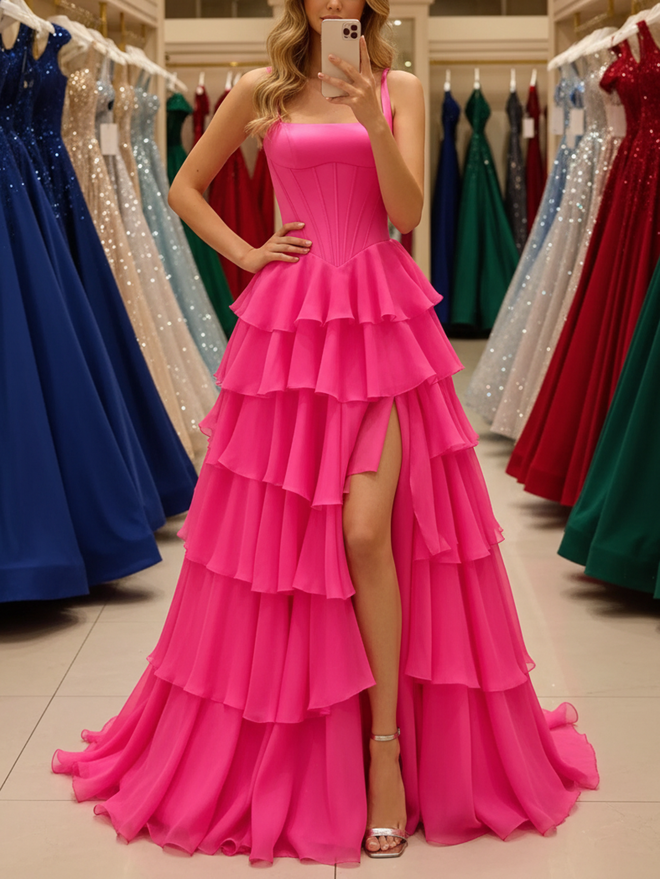 This tulle prom gown features corset on the bodice. The ruffled dress has a square neckline and layered hem. Worldprom ball gown prom dresses are ideal for party, evening or festivals.