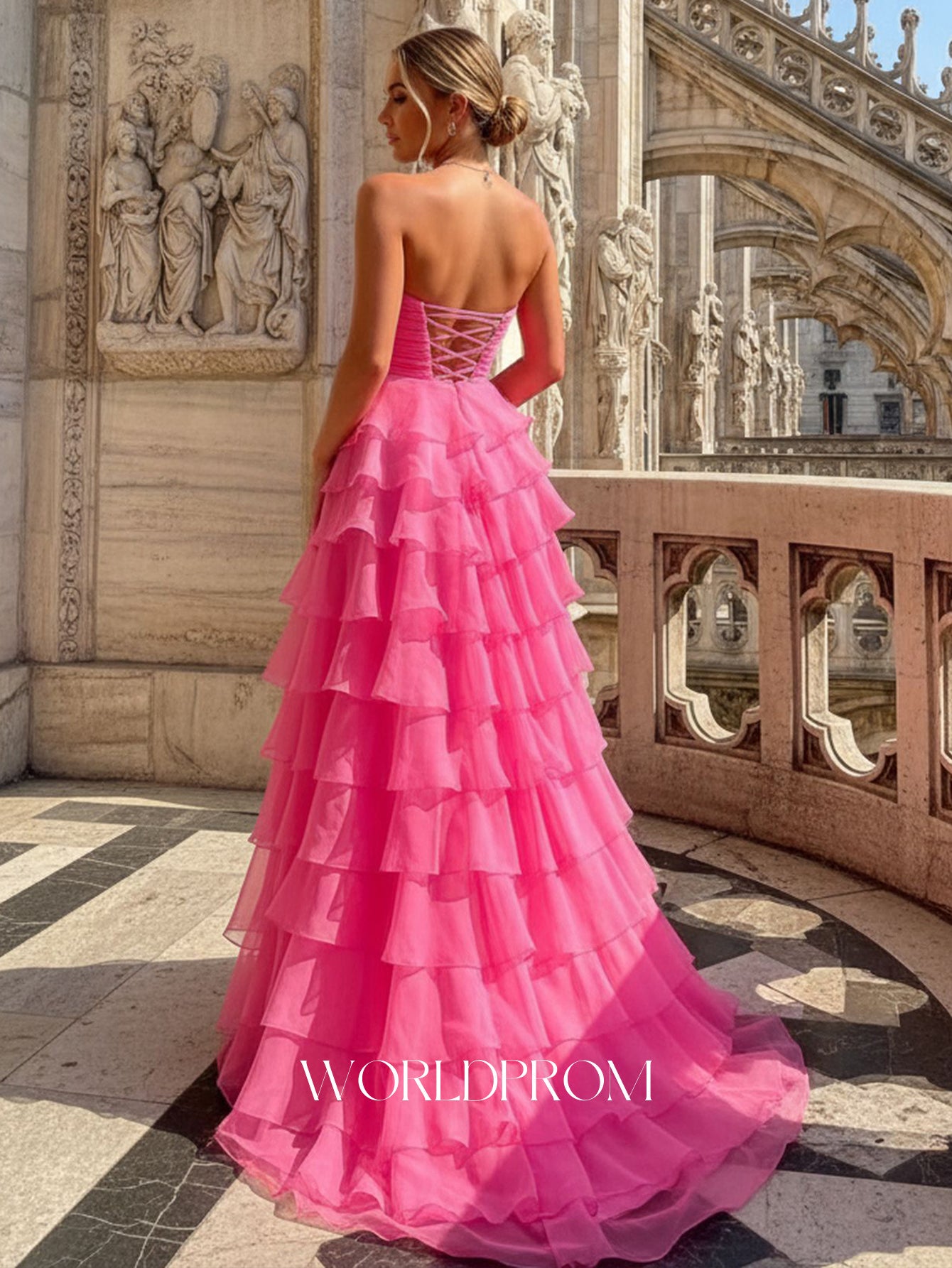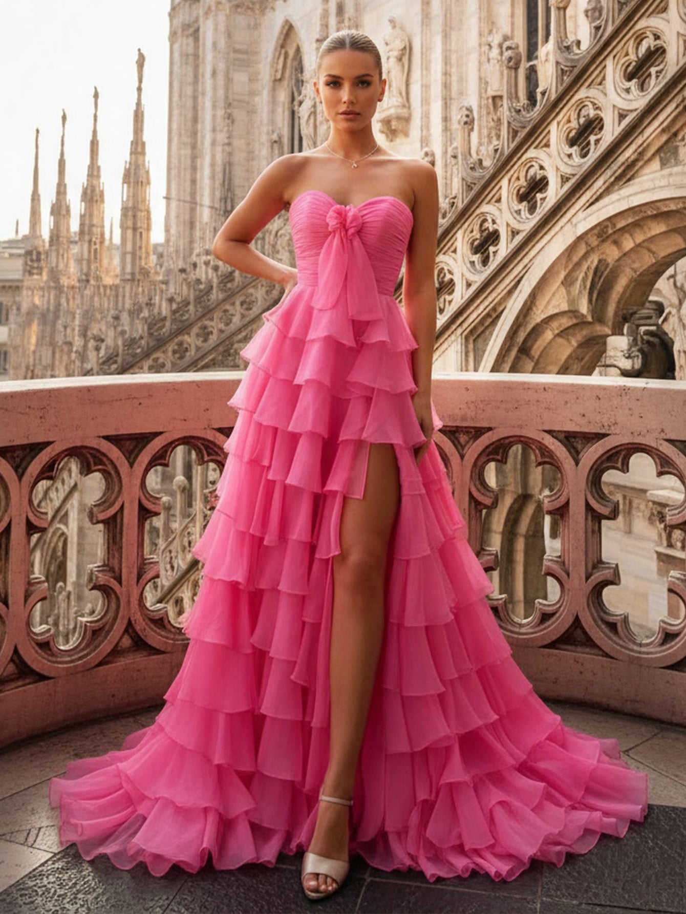 Sweetheart Ruffle Tiered Ball Gown Prom Dress - Hot Pink