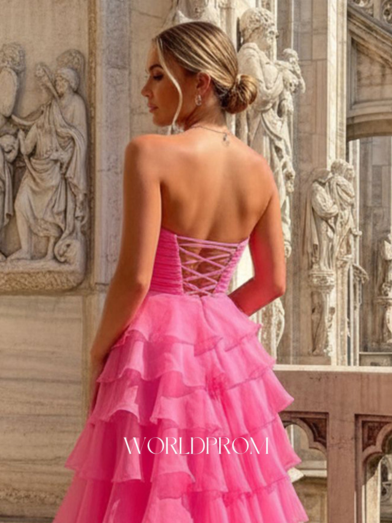 This chiffon prom gown features fitted waist on the bodice. The strapless dress has a sweetheart neck and ruffled tiered hem. This maxi formal dress ball gown is ideal for party, evening or festivals.