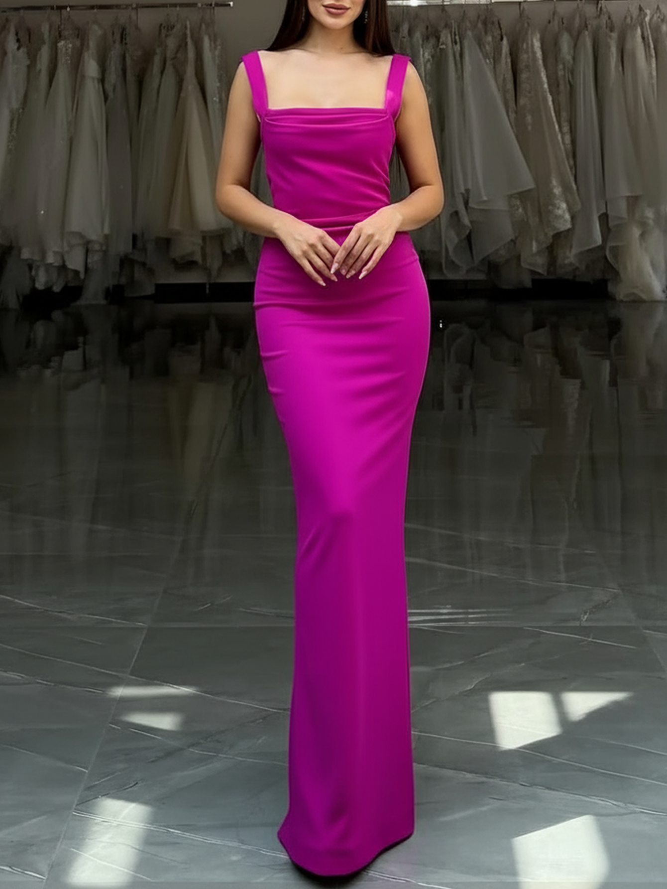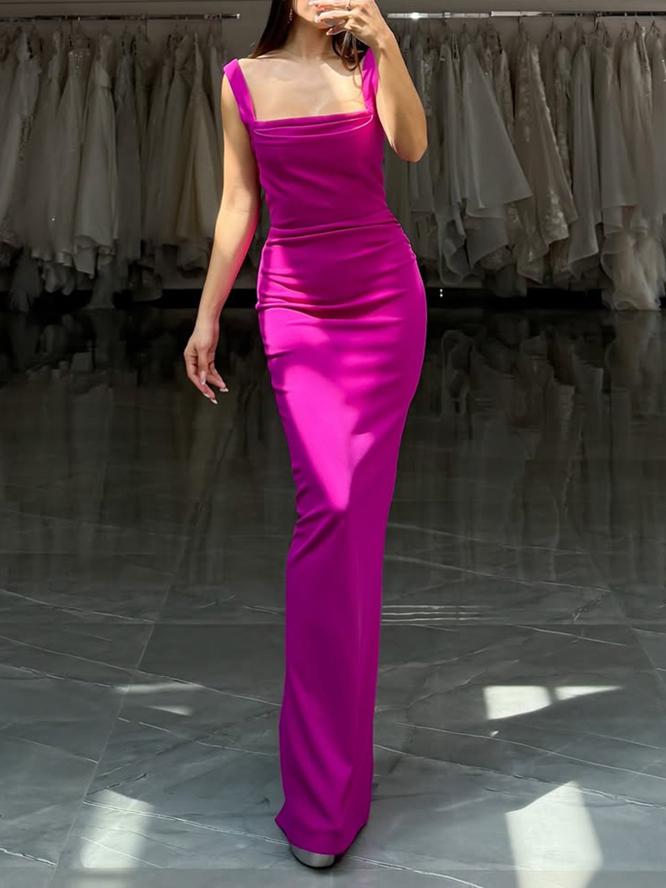 Tank Square Neck Ruched Bodice Mermaid Prom Dress - Hot Pink