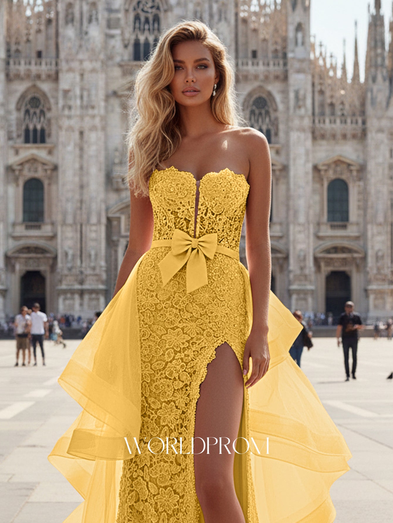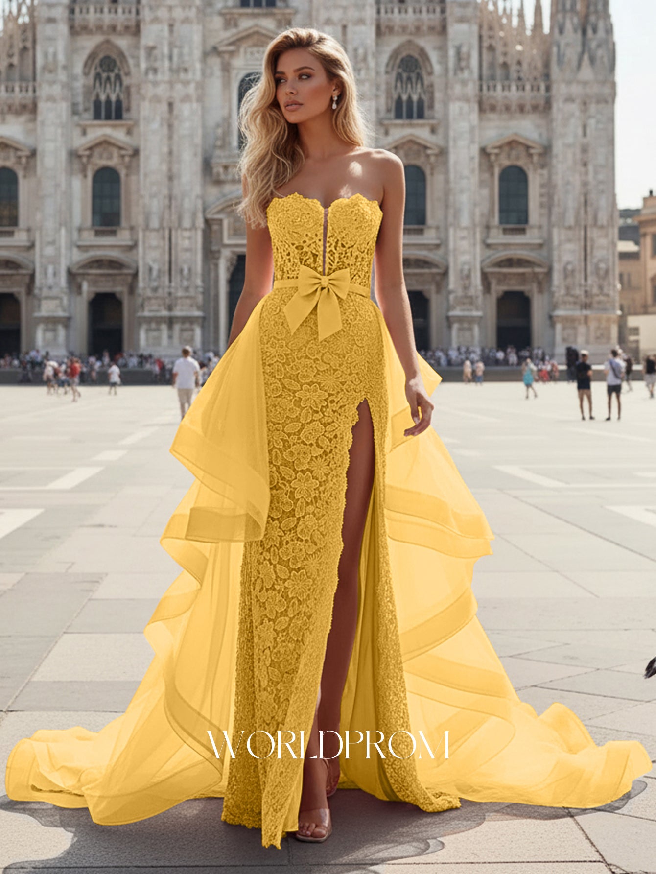 This lace prom gown features bow front with cut front sheer on the illusion bodice. The strapless dress has a sweetheart neckline and split hem with waist drop. Worldprom mermaid prom dresses are ideal for party, evening or festivals.