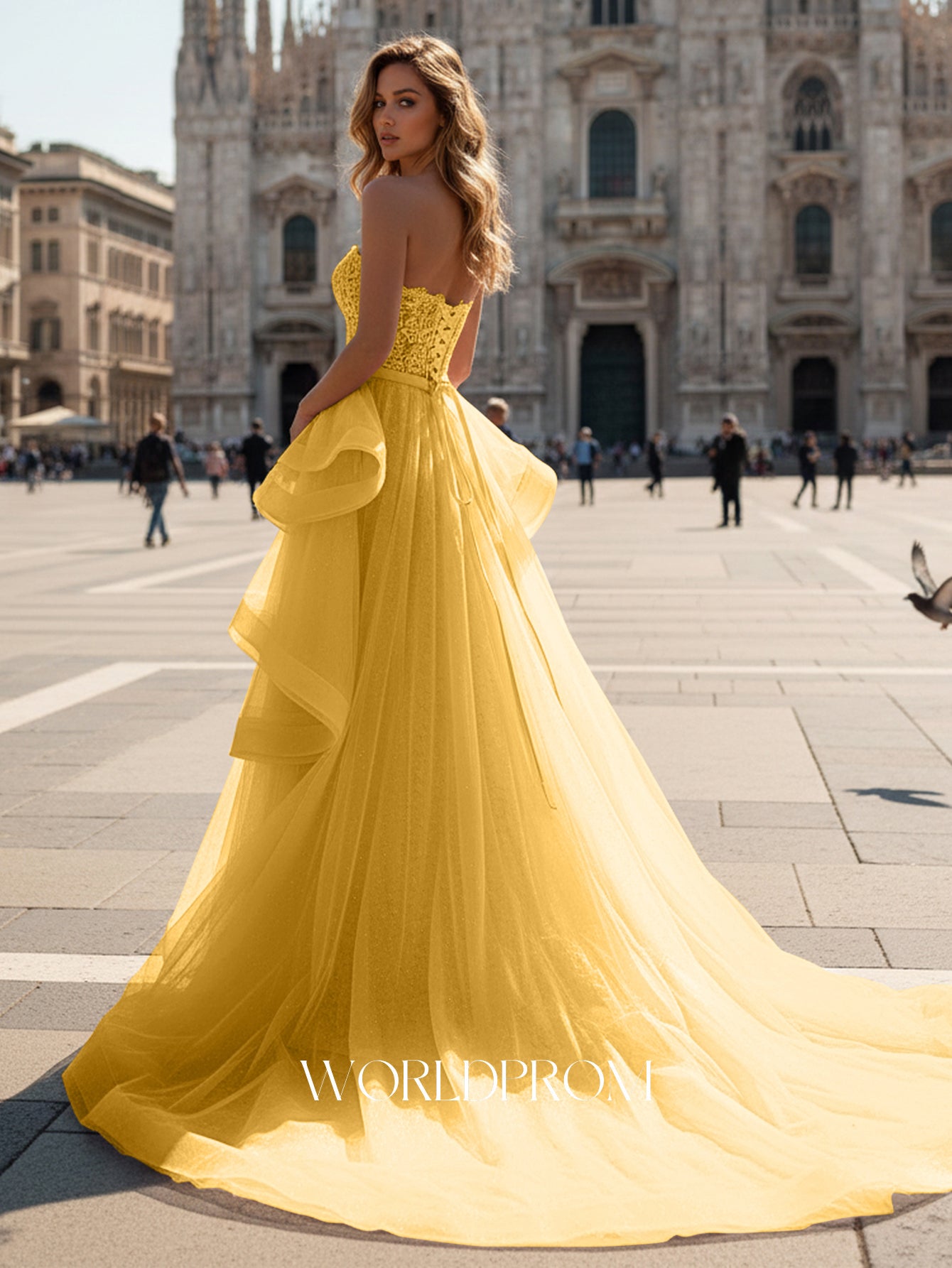 Bow Front Lace Illusion Floral Long Mermaid Prom Dress With Drop - Yellow