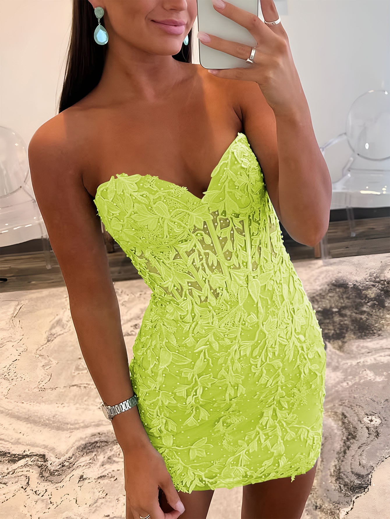 This lace mini hoco dress features lace embroidery on the bodice. The strapless short prom dress has a sweetheart neck and sheath hem. The green hoco dress is ideal for graduation party, homecoming or prom party.