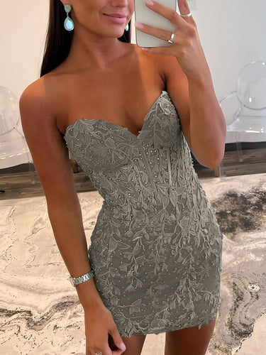 Lace Embroidery Sheer Bodice Mini Prom Dress - Grey