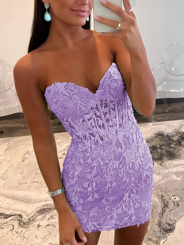 Lace Embroidery Sheer Bodice Mini Prom Dress - Lilac