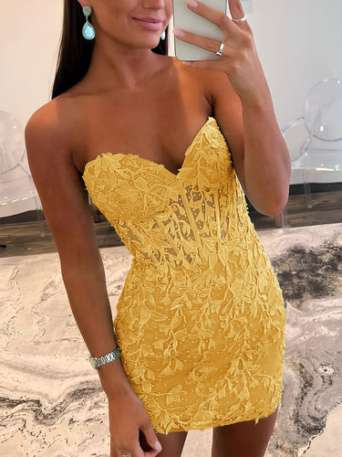 Lace Embroidery Sheer Bodice Mini Prom Dress - Mustard Yellow