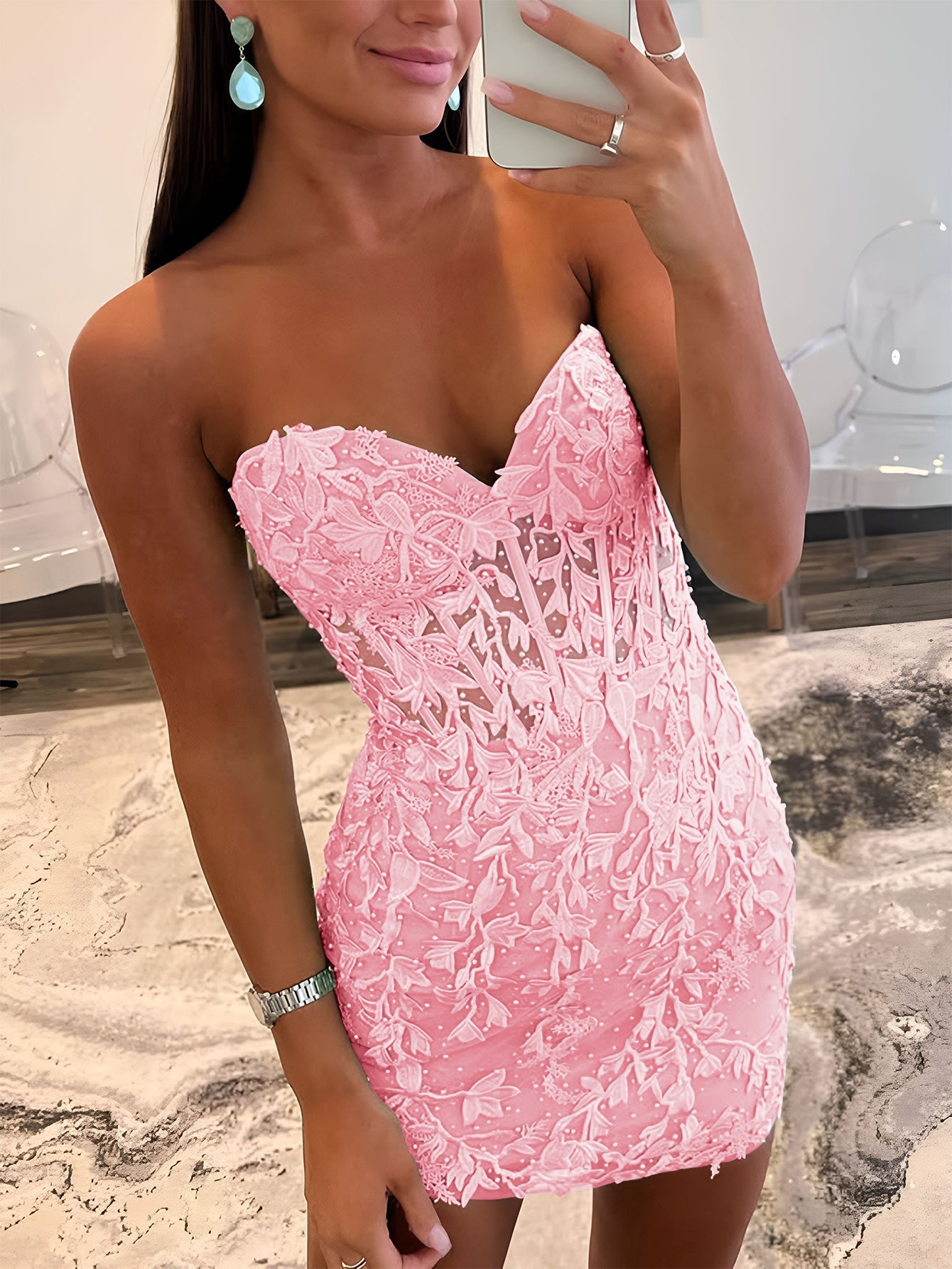 Lace Embroidery Sheer Bodice Mini Prom Dress - Pink