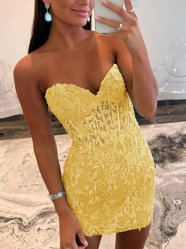 Lace Embroidery Sheer Bodice Mini Prom Dress - Yellow