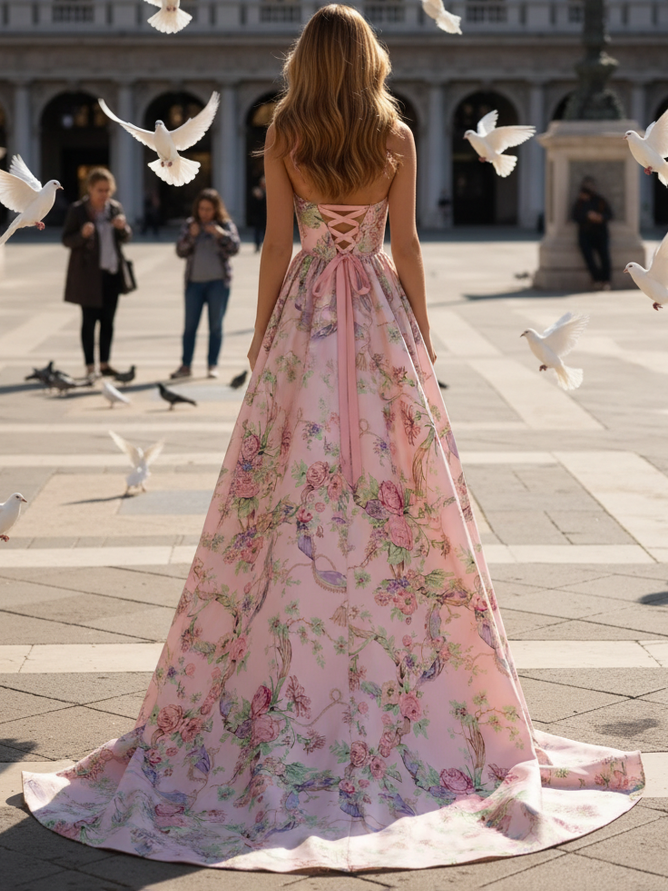 Details: Floral Print, Pleated, Split, Backless, Lace Up, Cut Front