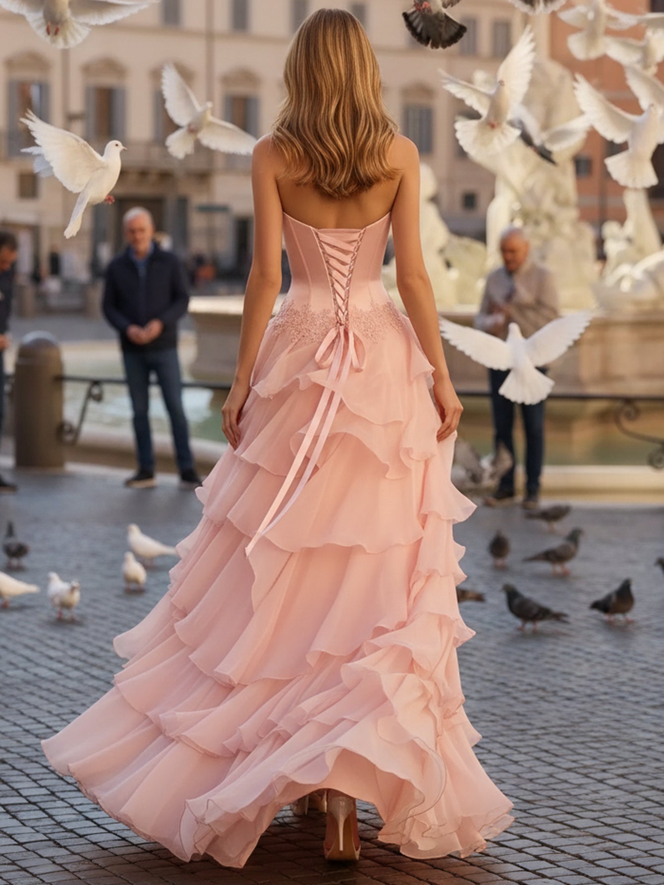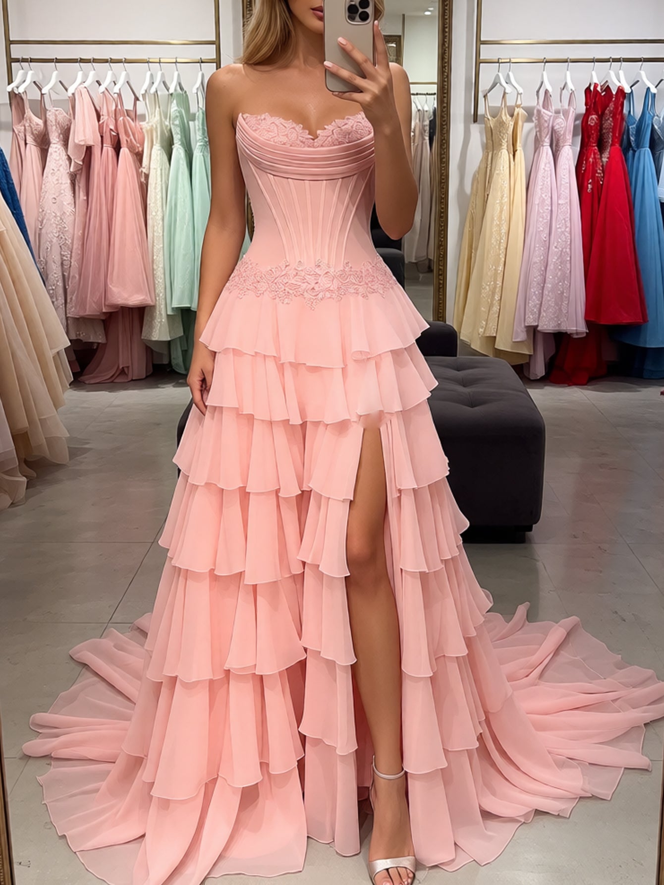 Lace Ruched Bust Layered Ruffle Hem Long Ball Gown Prom Dress With Slit - Light Pink