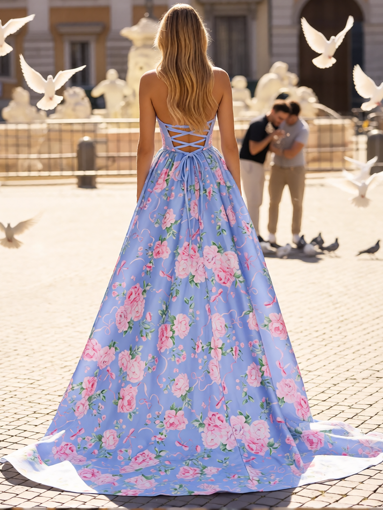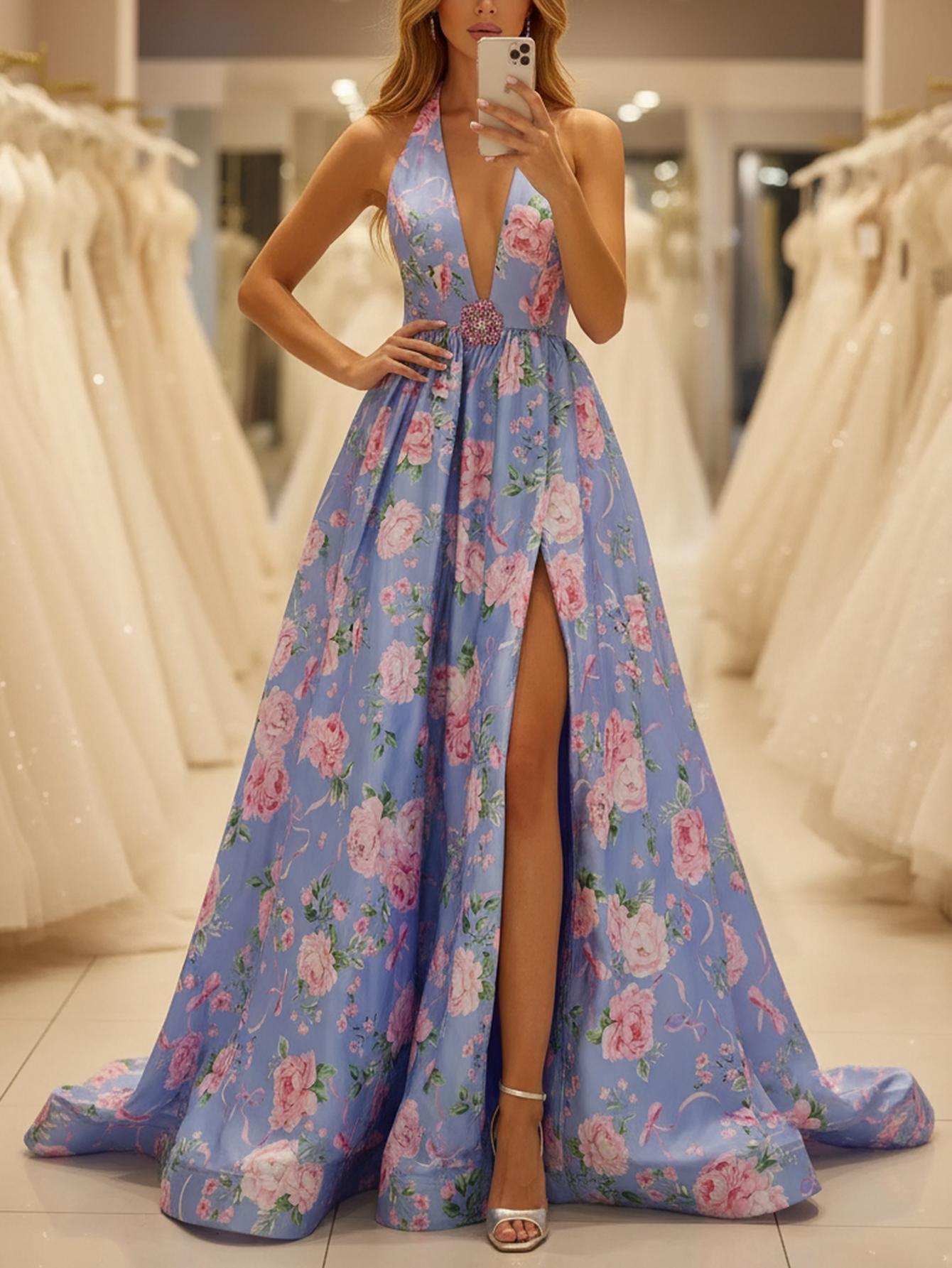 This satin prom gown features floral print on the bodice. The halter maxi dress has a deep V-neckline and split hem. Worldprom a-line prom dresses are ideal for party, evening or festivals.