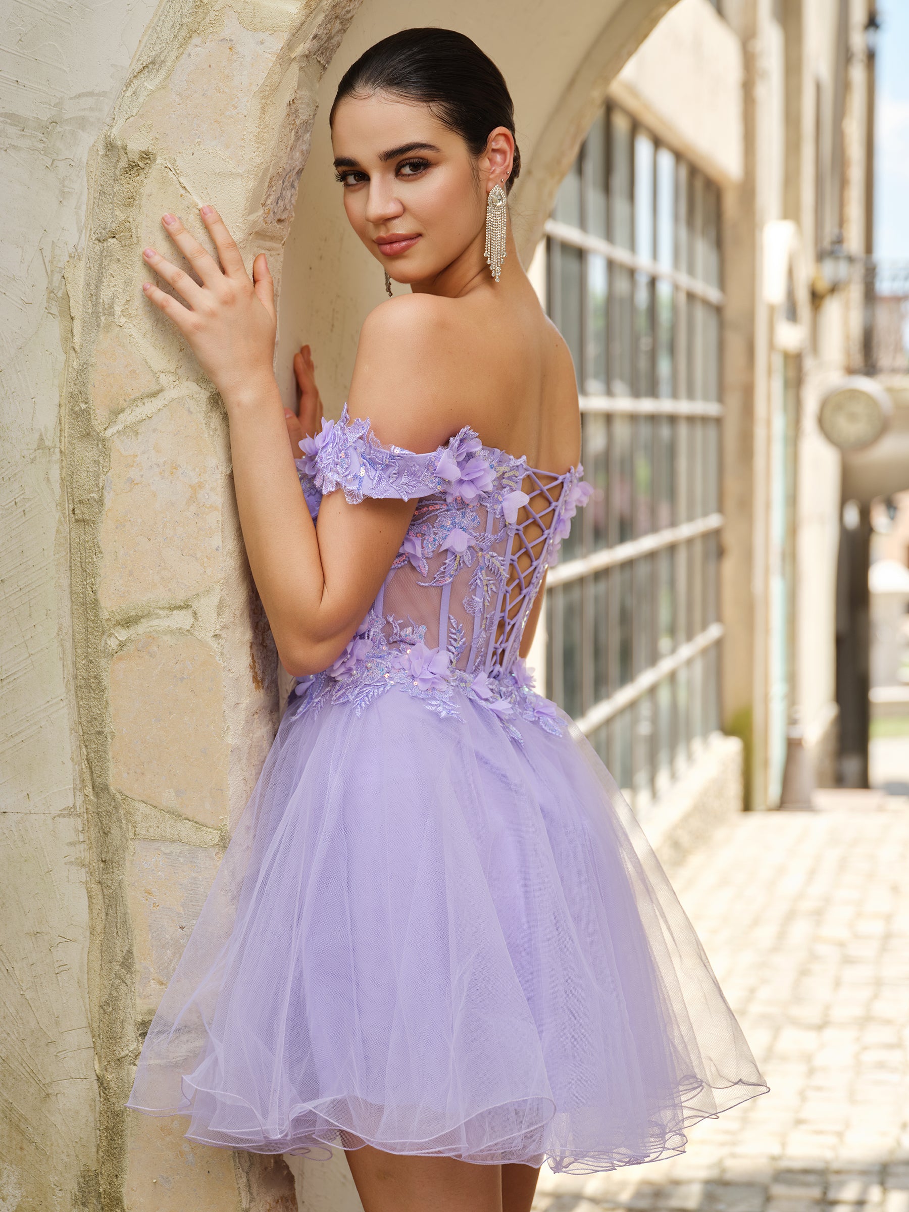 3D Rose Boned Off Shoulder Mini Ball Gown Prom Dress - Lilac