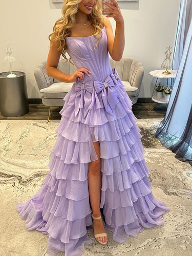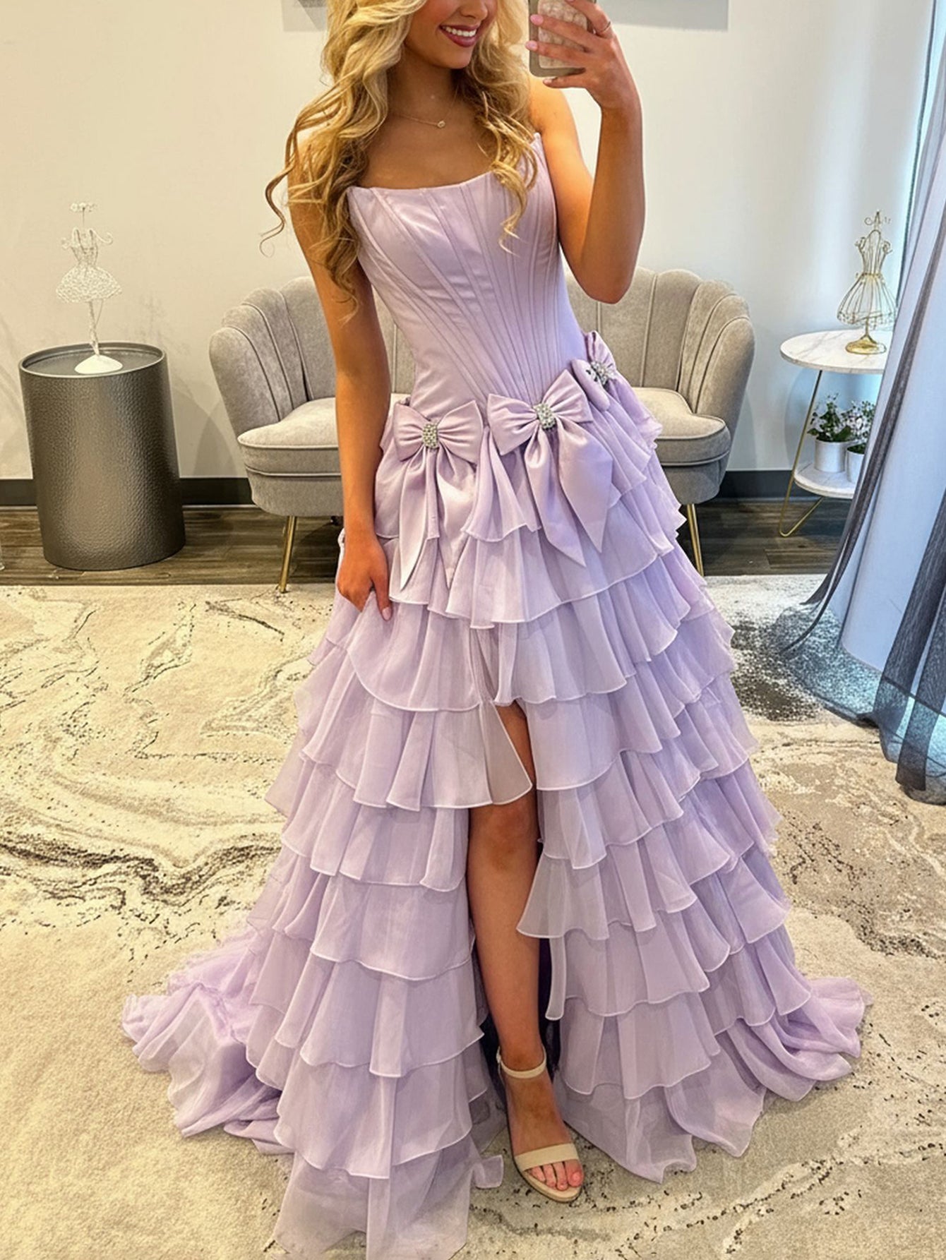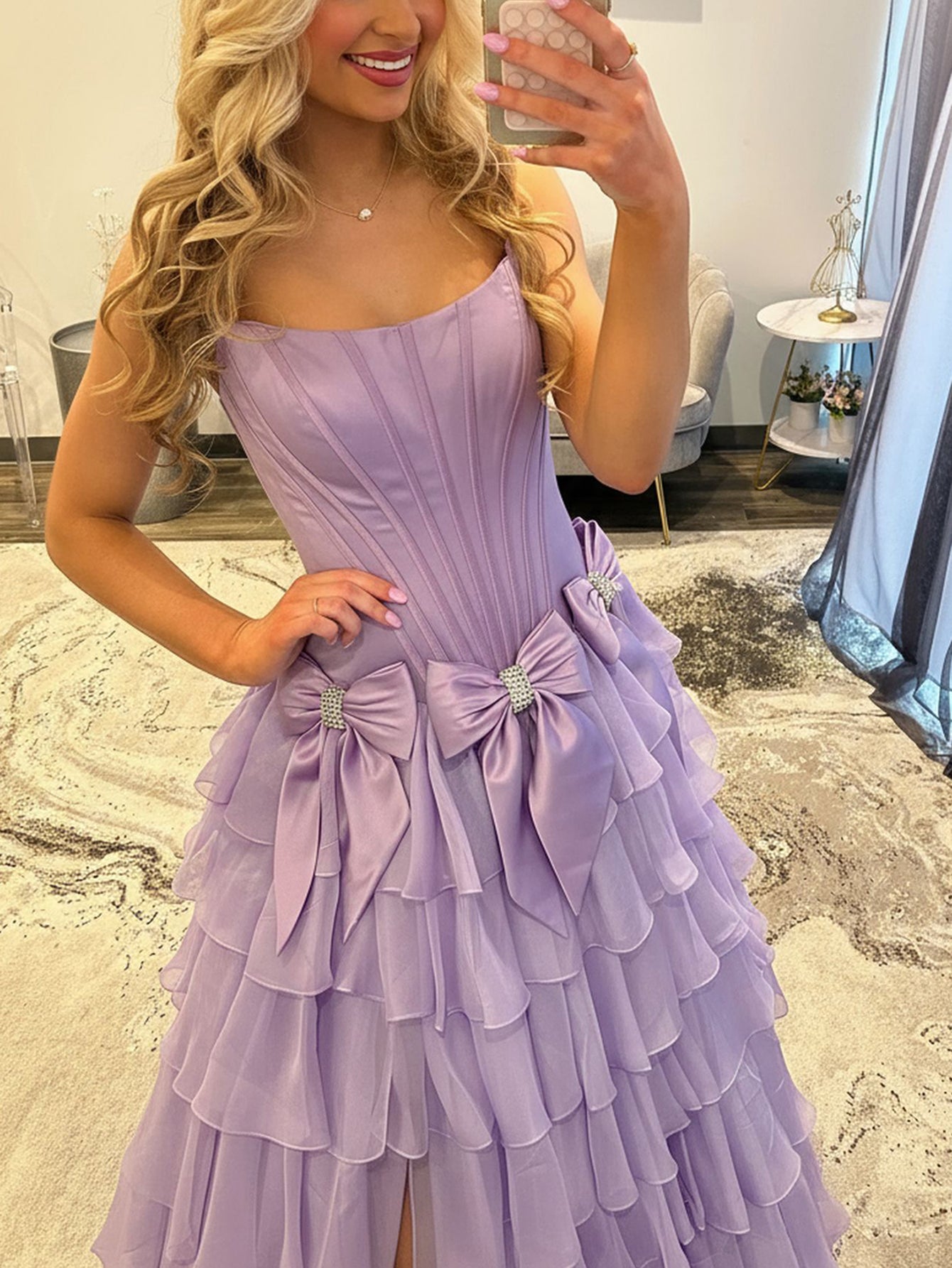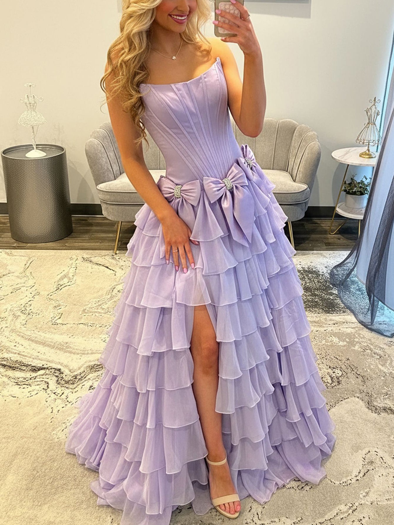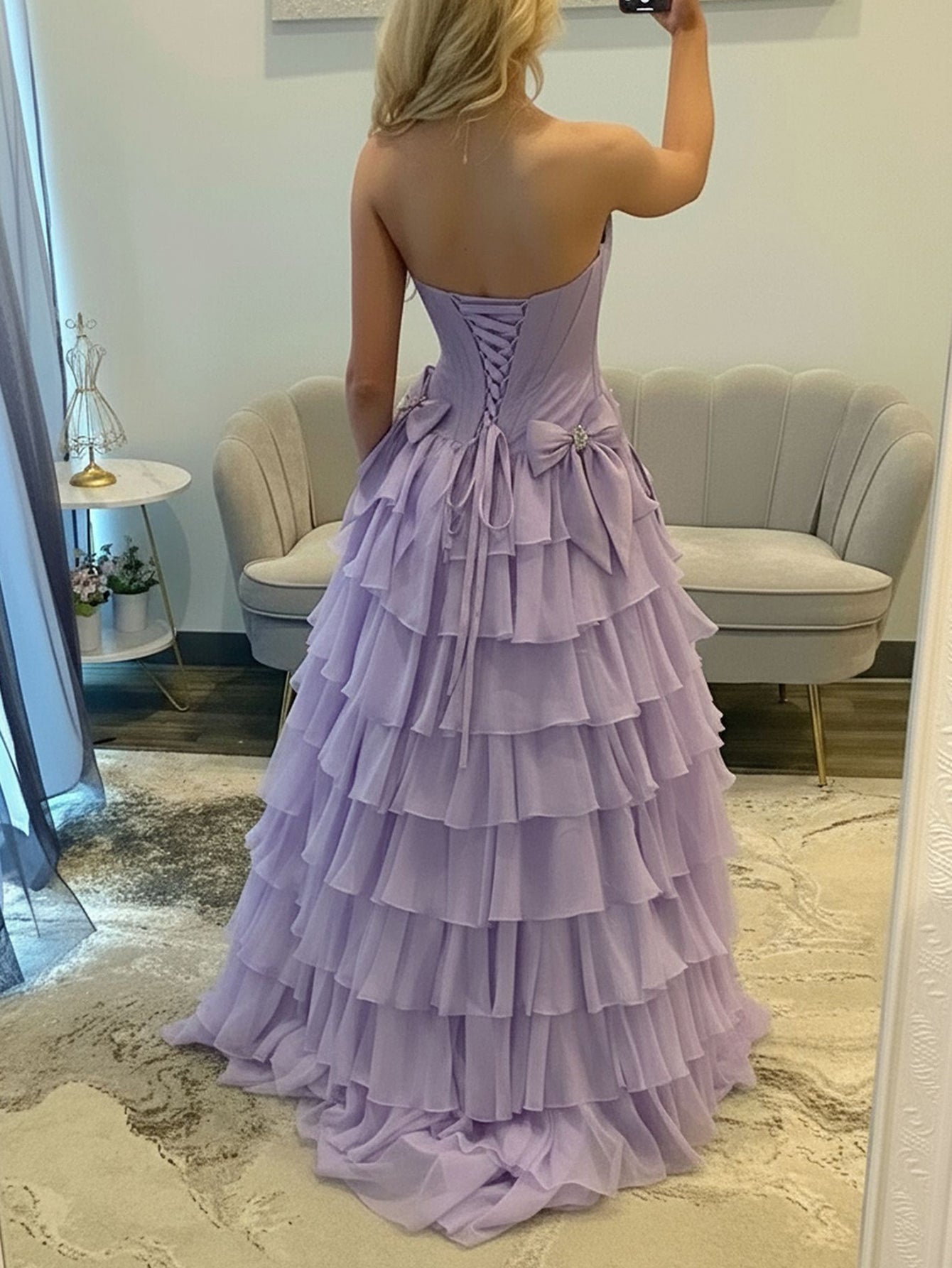 Boned Strapless Tiered Ball Gown Prom Dress Long With Bow - Lilac