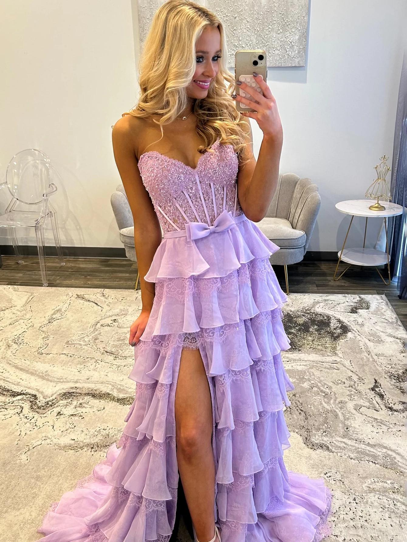 Sparkly Beading Bow Front Lace Up Bodice A-Line Long Prom Dress With Slit - Lilac
