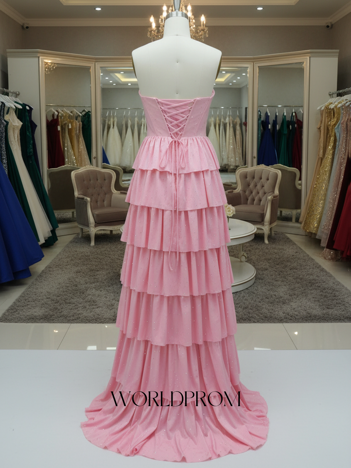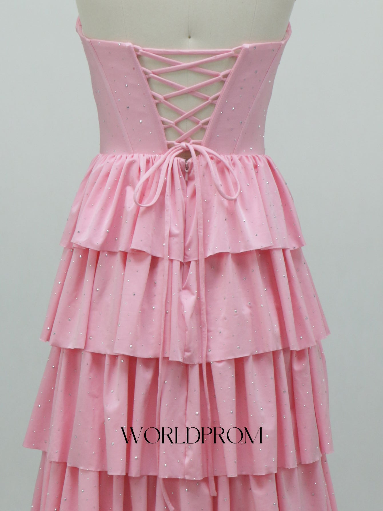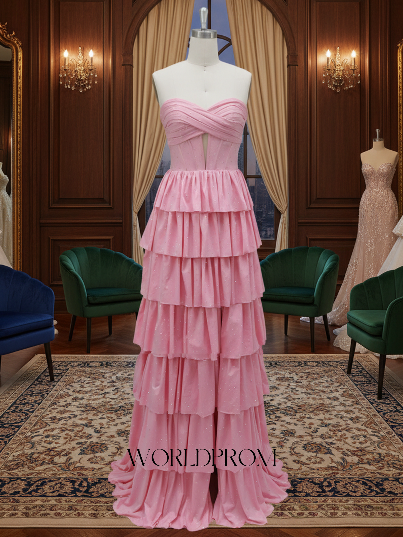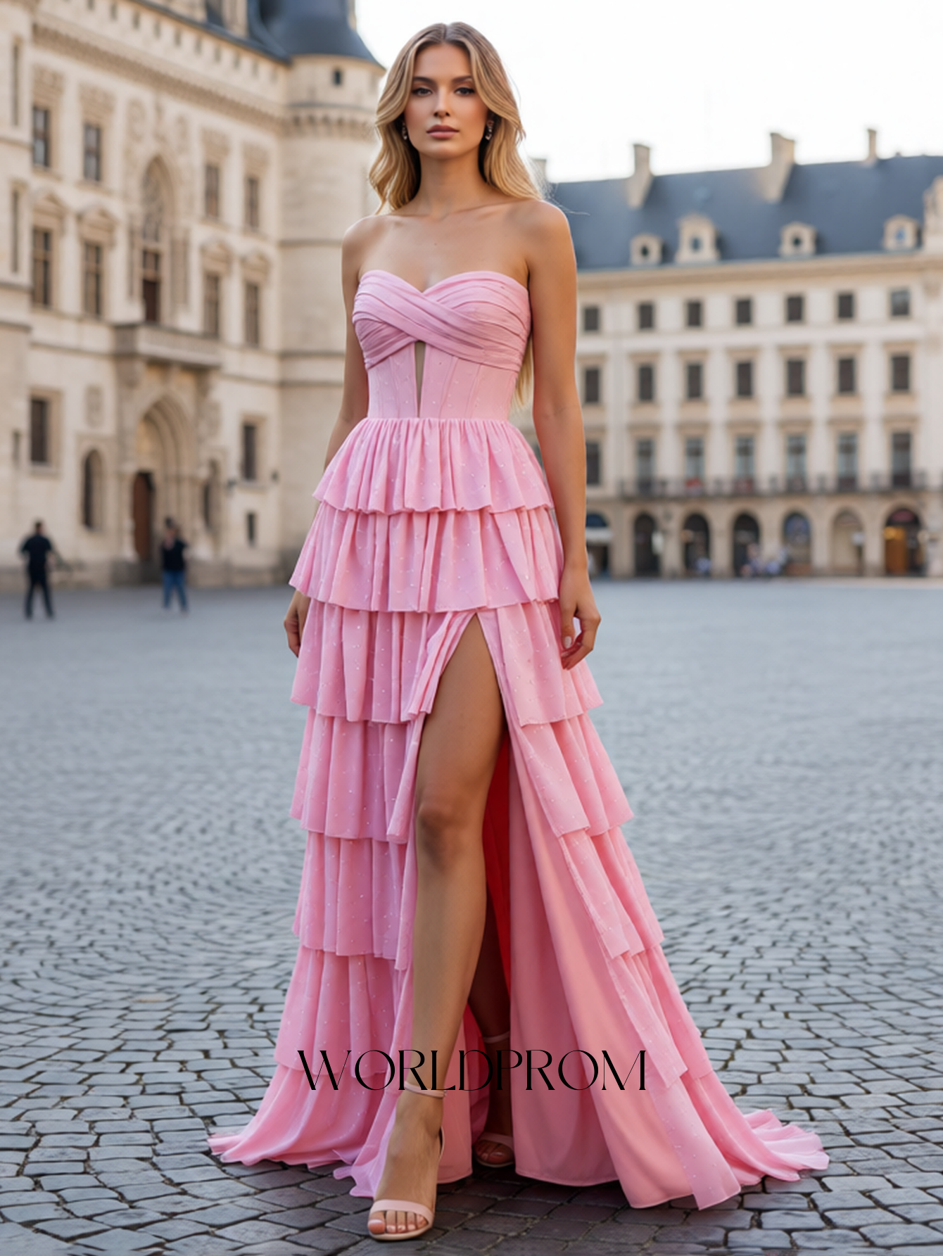 Ruched Bust Cut Front Hot Fix Crystal Layered Ruffle Hem Long Prom Dress With Slit - Pink