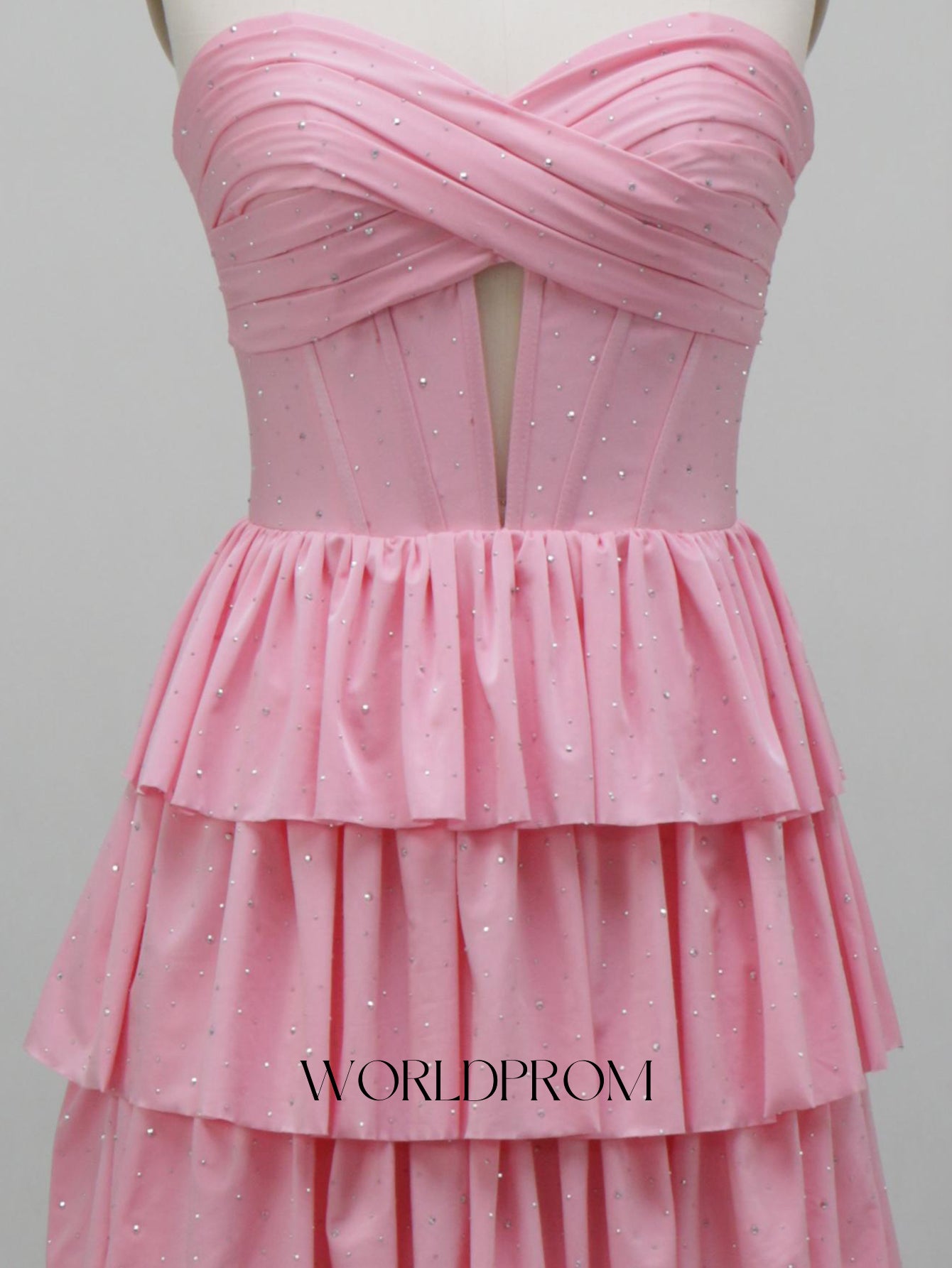This satin prom gown features hot fix ruched bust with cut front on the bodice. The strapless crystal dress has a sweetheart neckline and split hem. Worldprom a-line prom dresses are ideal for party, evening or festivals.