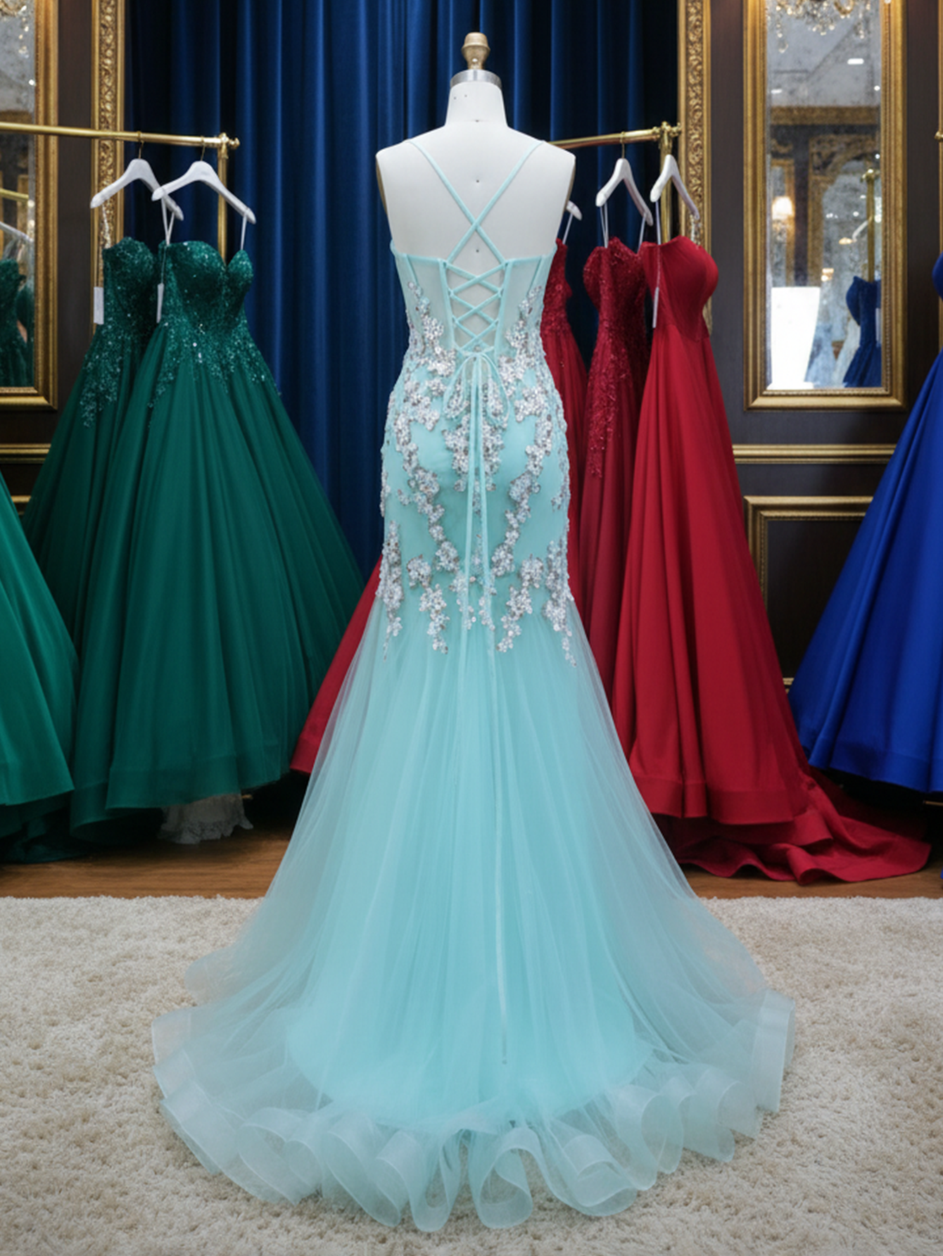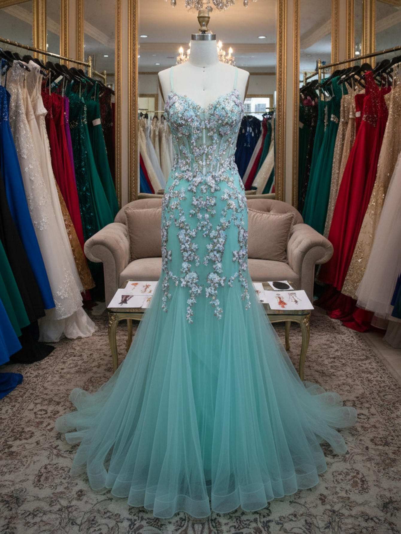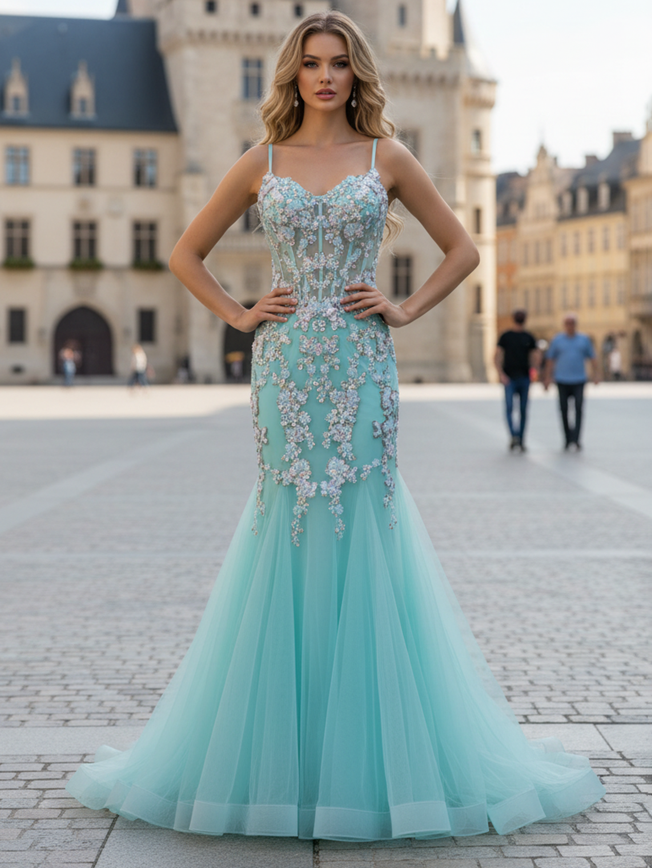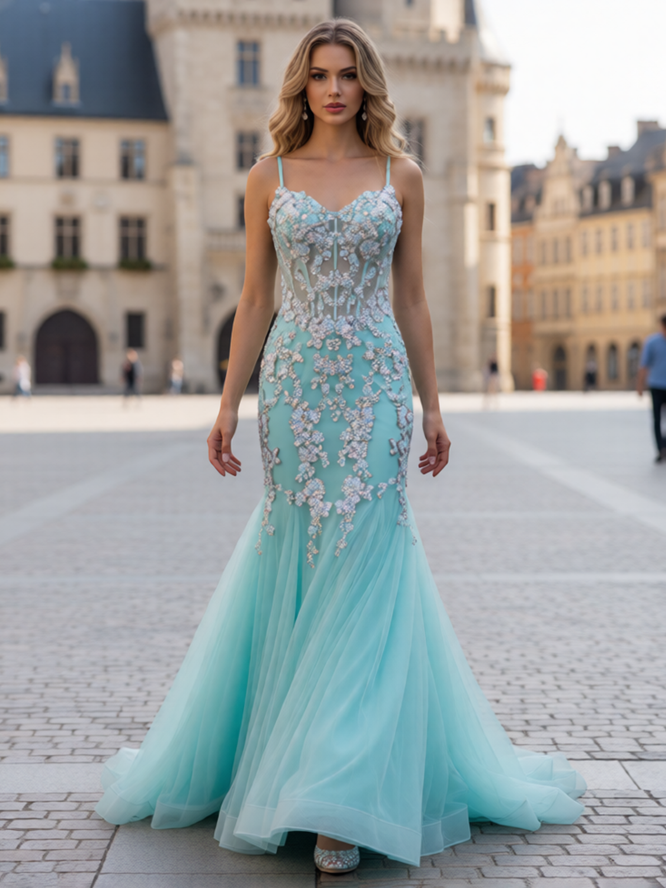 Sparkly Beading 3D Flowers Spaghetti Shoulder Straps Floral Mermaid Long Prom Dress - Turquoise