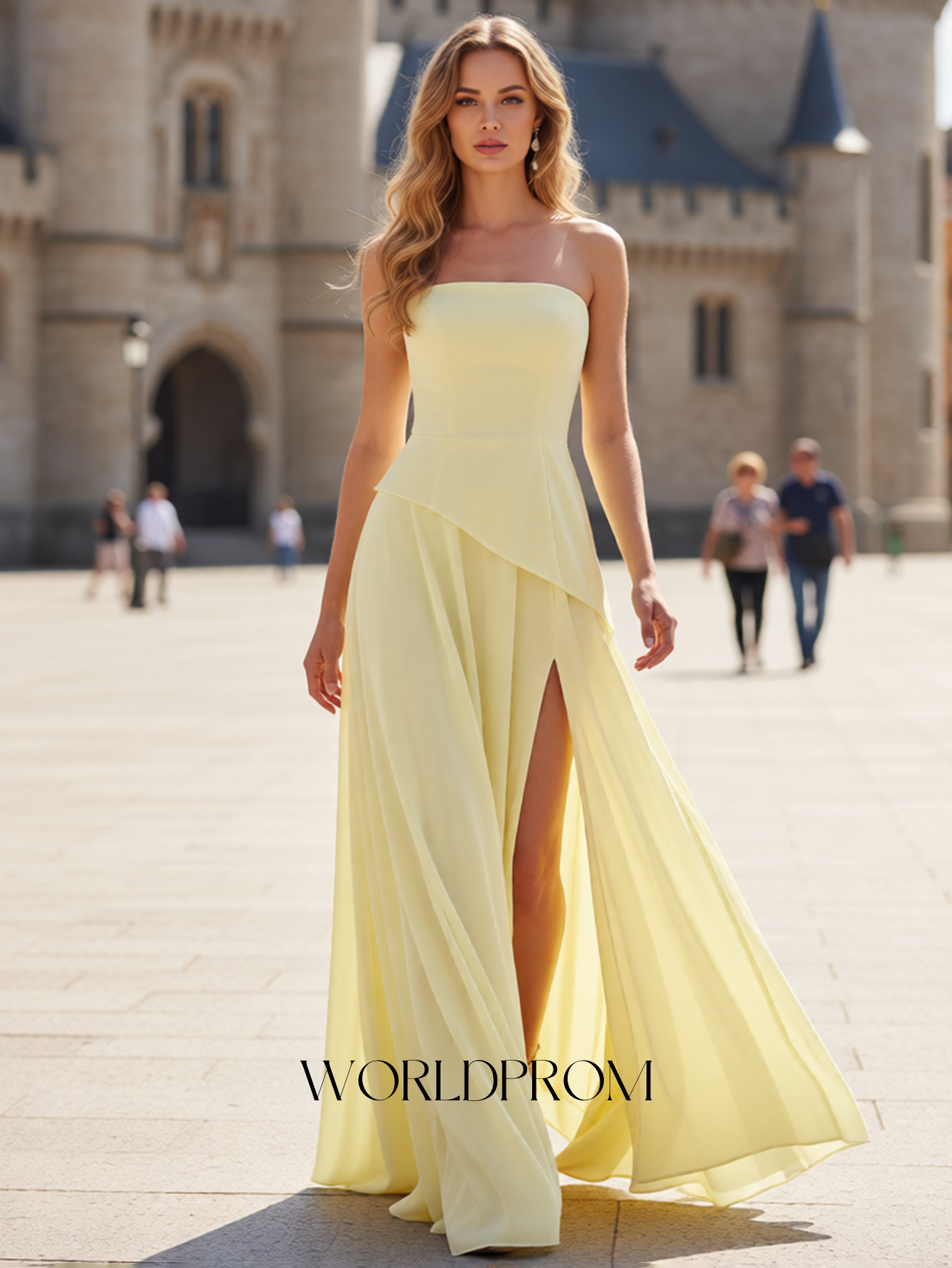 This chiffon prom gown features fitted waist on the bodice. The strapless dress has a scoop neckline and slit hem. Worldprom a-line prom dresses are ideal for party, evening or festivals.