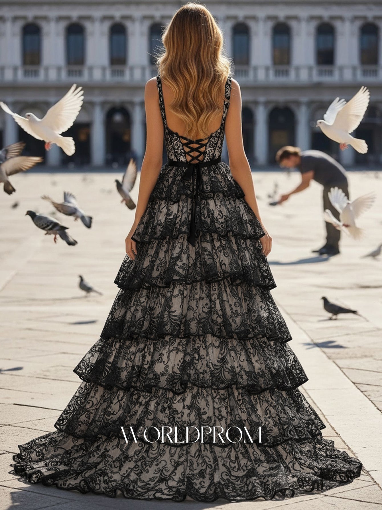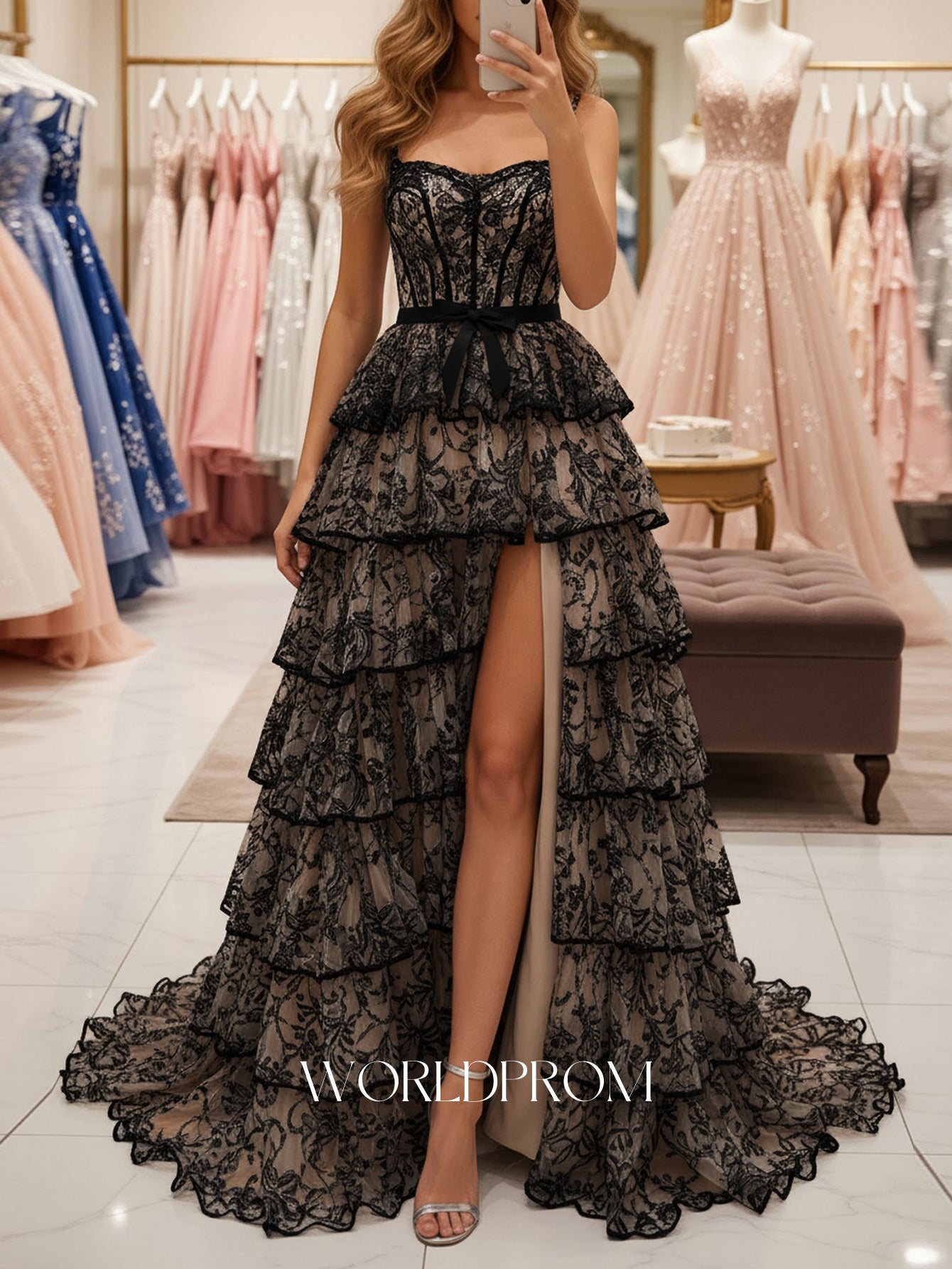 This lace prom gown features bow front with embroidery on the illusion bodice. The spaghetti straps dress has a scoop neckline and ruffled hem. Worldprom a-line prom dresses are ideal for party, evening or festivals.