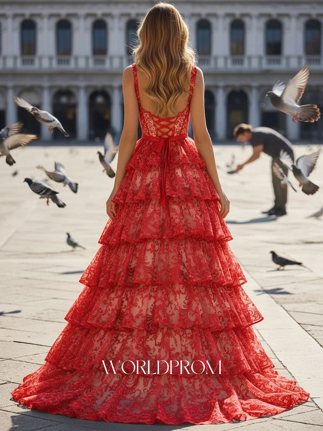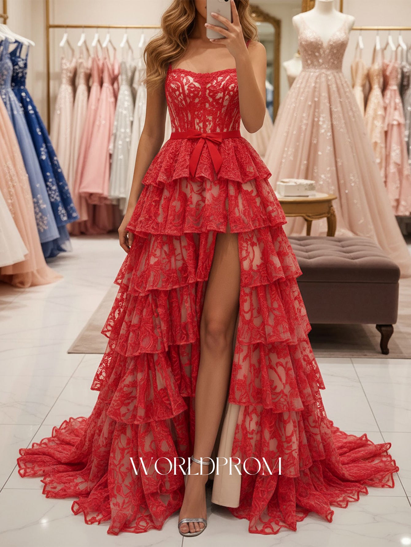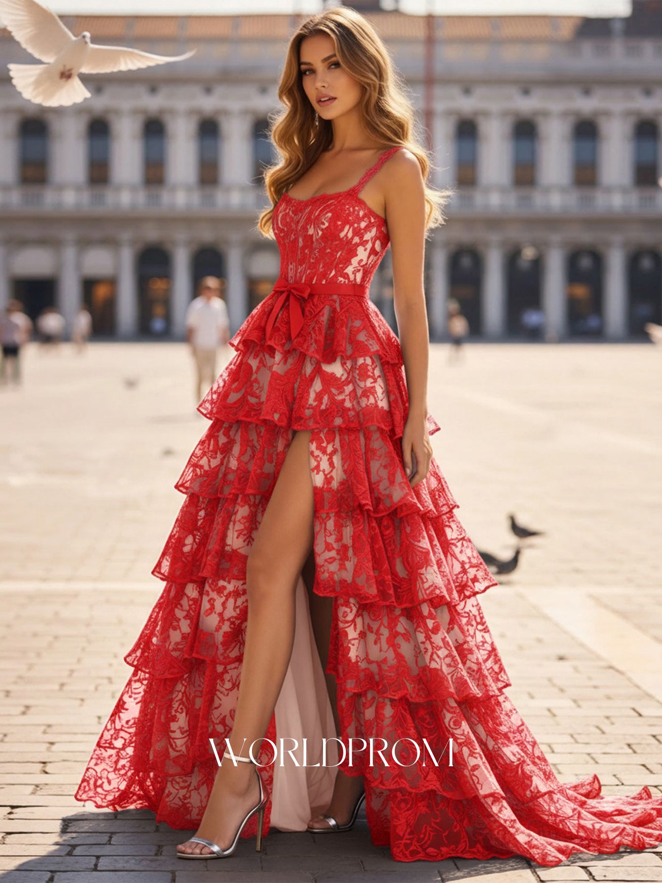 This lace prom gown features bow front with embroidery on the illusion bodice. The spaghetti straps dress has a scoop neckline and ruffled hem. Worldprom a-line prom dresses are ideal for party, evening or festivals.