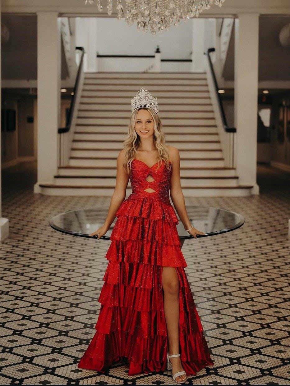 This satin prom gown features cut front with crystal on the bodice. The strapless evening dress has a sweetheart neckline and ruffle hem. This long evening dress is ideal for party, evening or festivals.