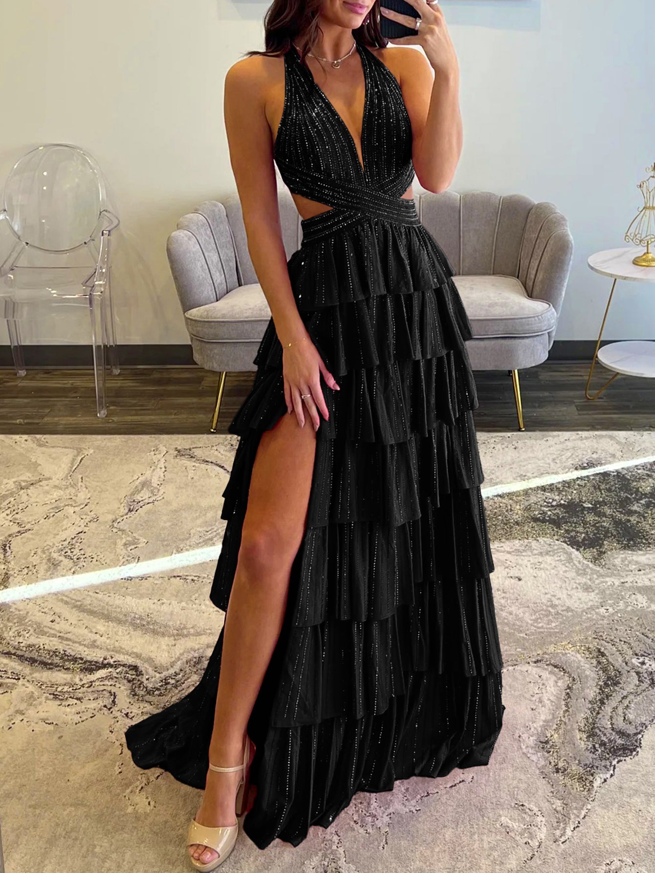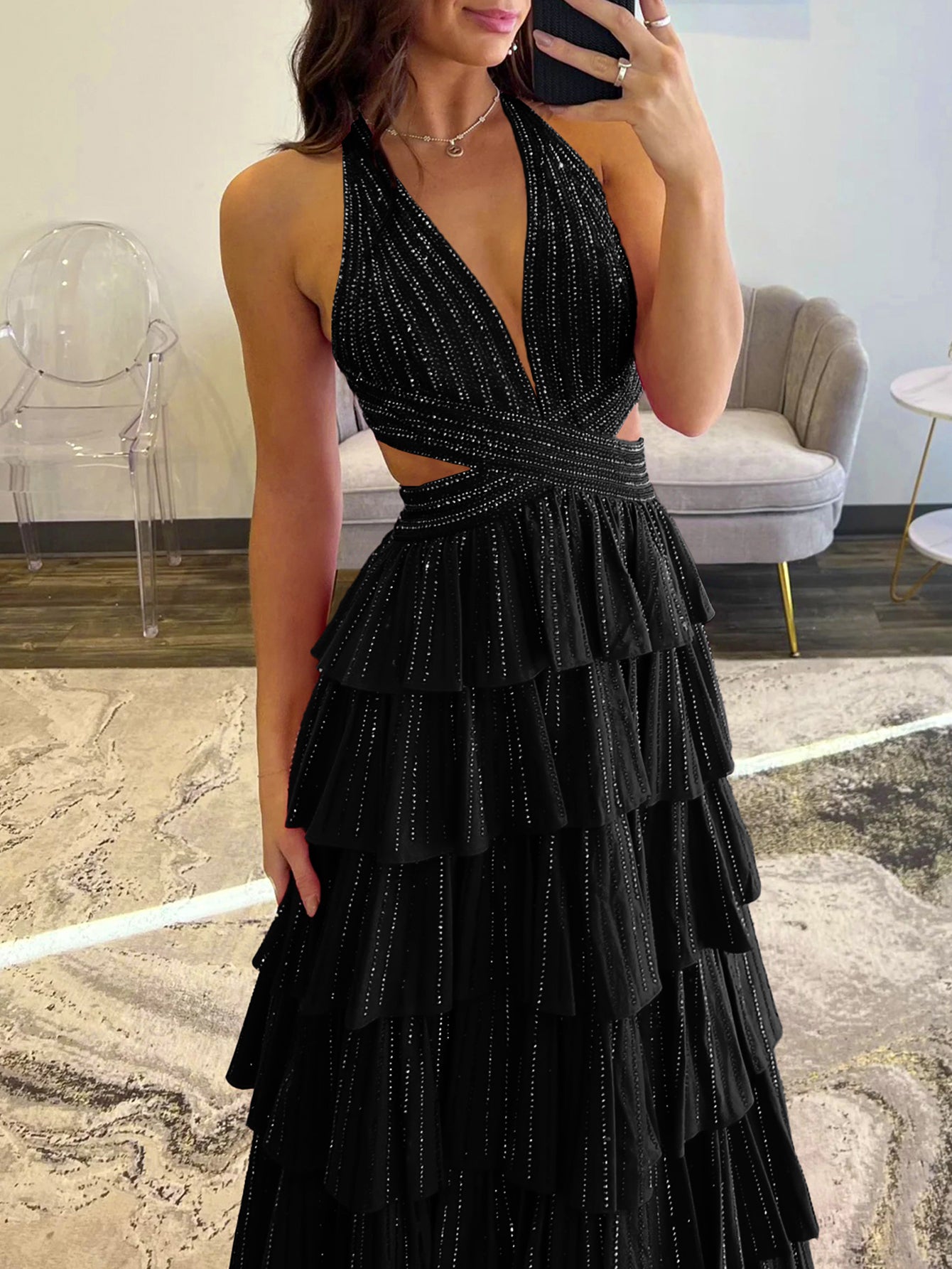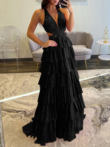 Cut Waist Halter Crystal Ruffle Ball Gown Prom Dress - Black