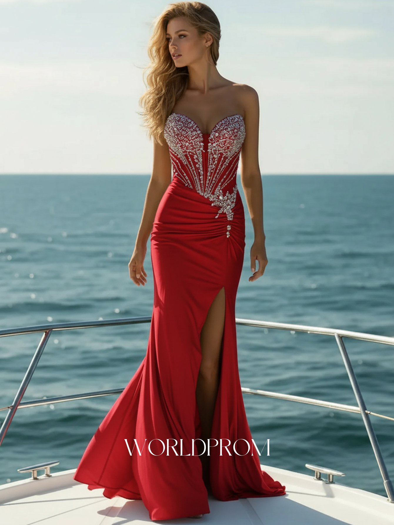 This satin prom gown features hot fix with crystal on the bodice. The strapless dress has a sweetheart neckline and split hem. Worldprom mermaid prom dresses are ideal for party, evening or festivals.