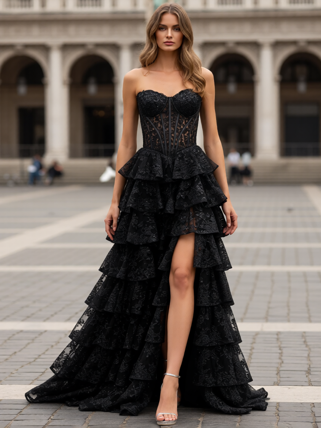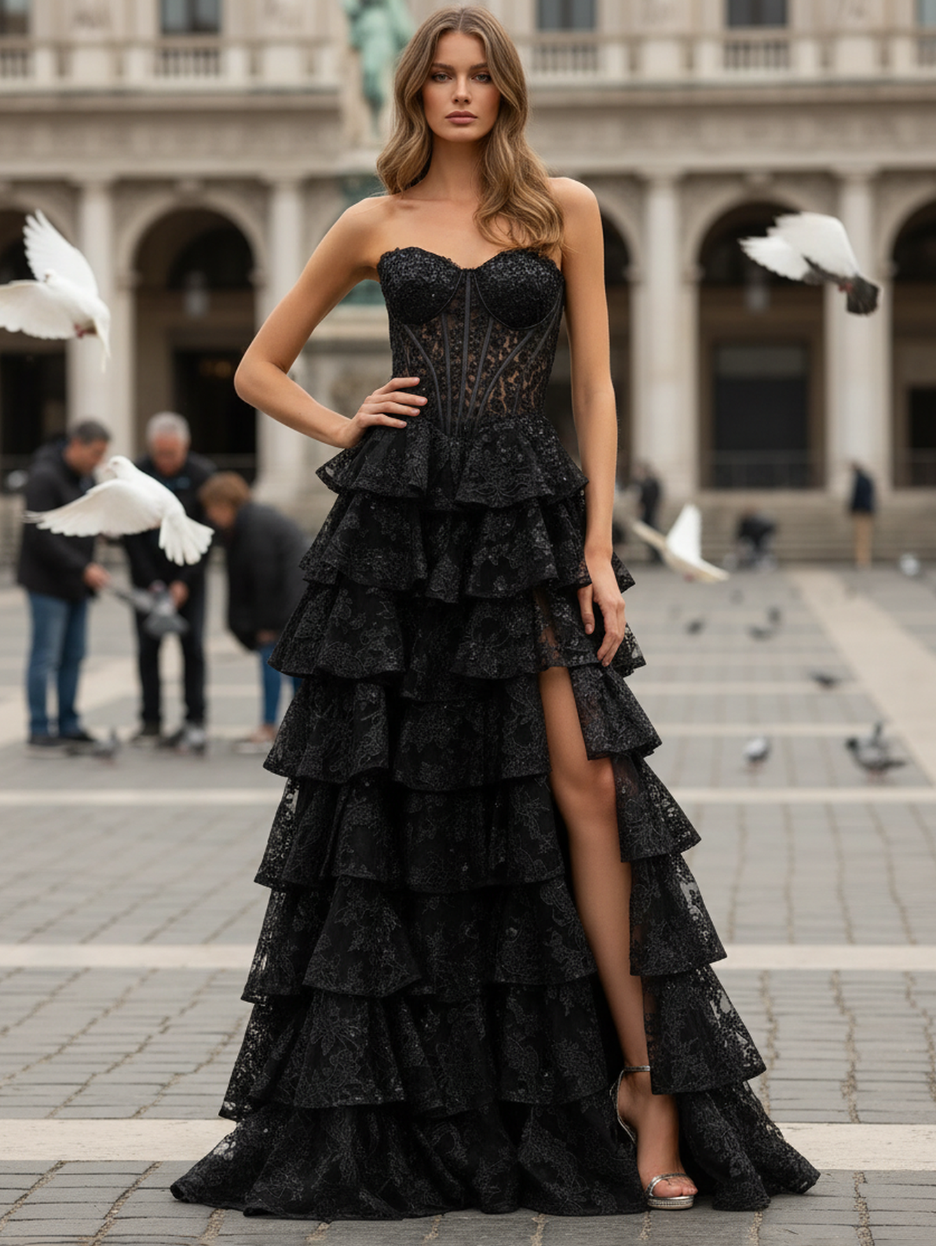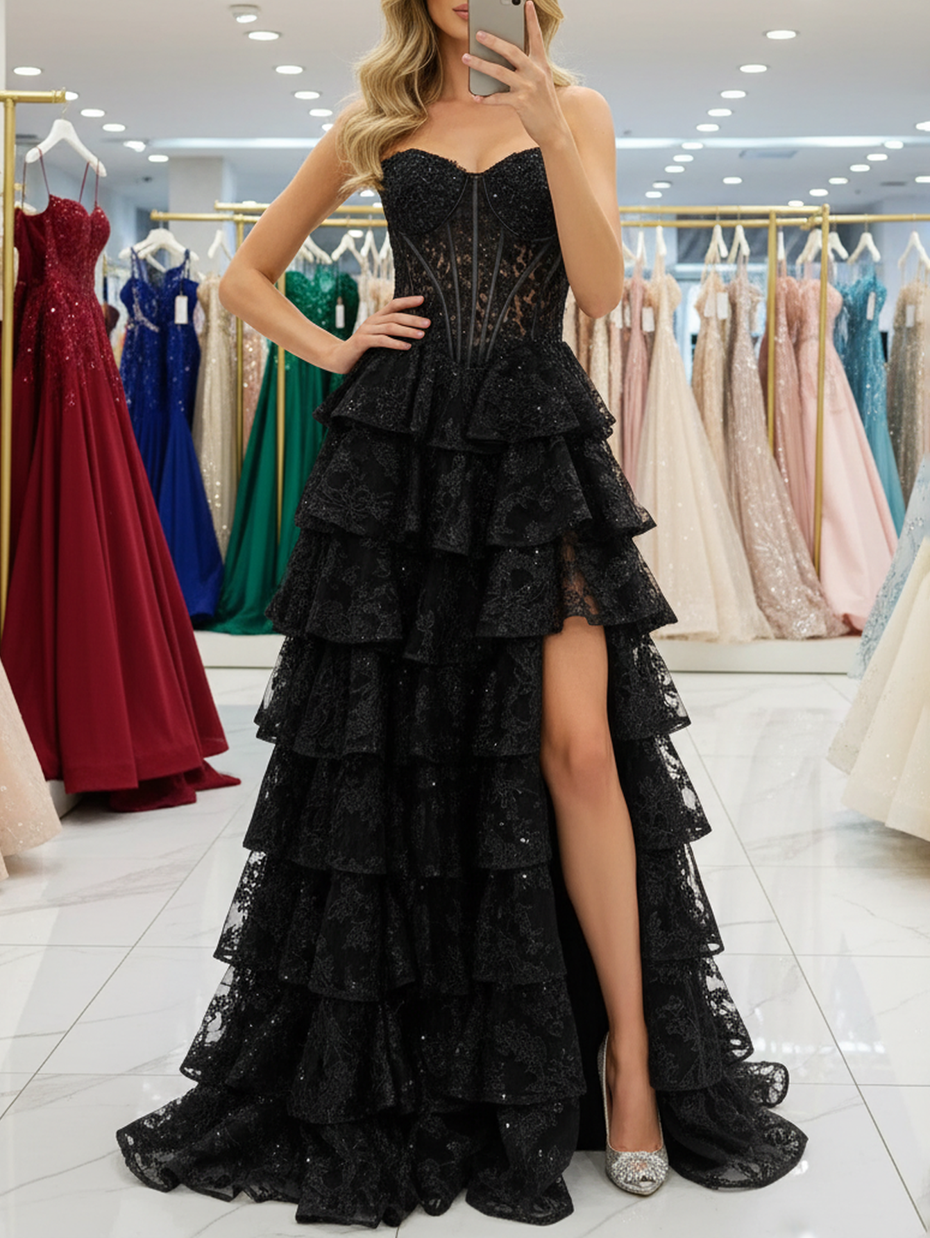 Details: Sparkly, Embroidery, Ruffled, Layered, Illusion