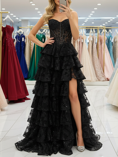 This tulle prom gown features sparkly embroidery on the bodice. The strapless maxi dress has a V-neckline and layered hem. Worldprom ball gown prom dresses are ideal for party, evening or festivals.