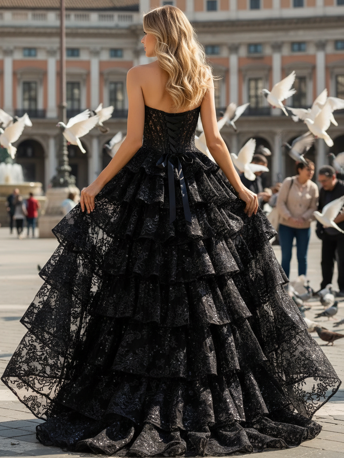 Sparkly Embroidery Ruffle Lace Up Illusion Bodice Long Ball Gown Prom Dress - Black