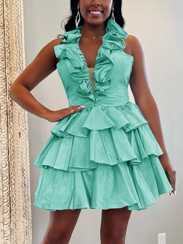Ruffle Halter Deep V-Neck Satin Mini Prom Dress - Mint Green