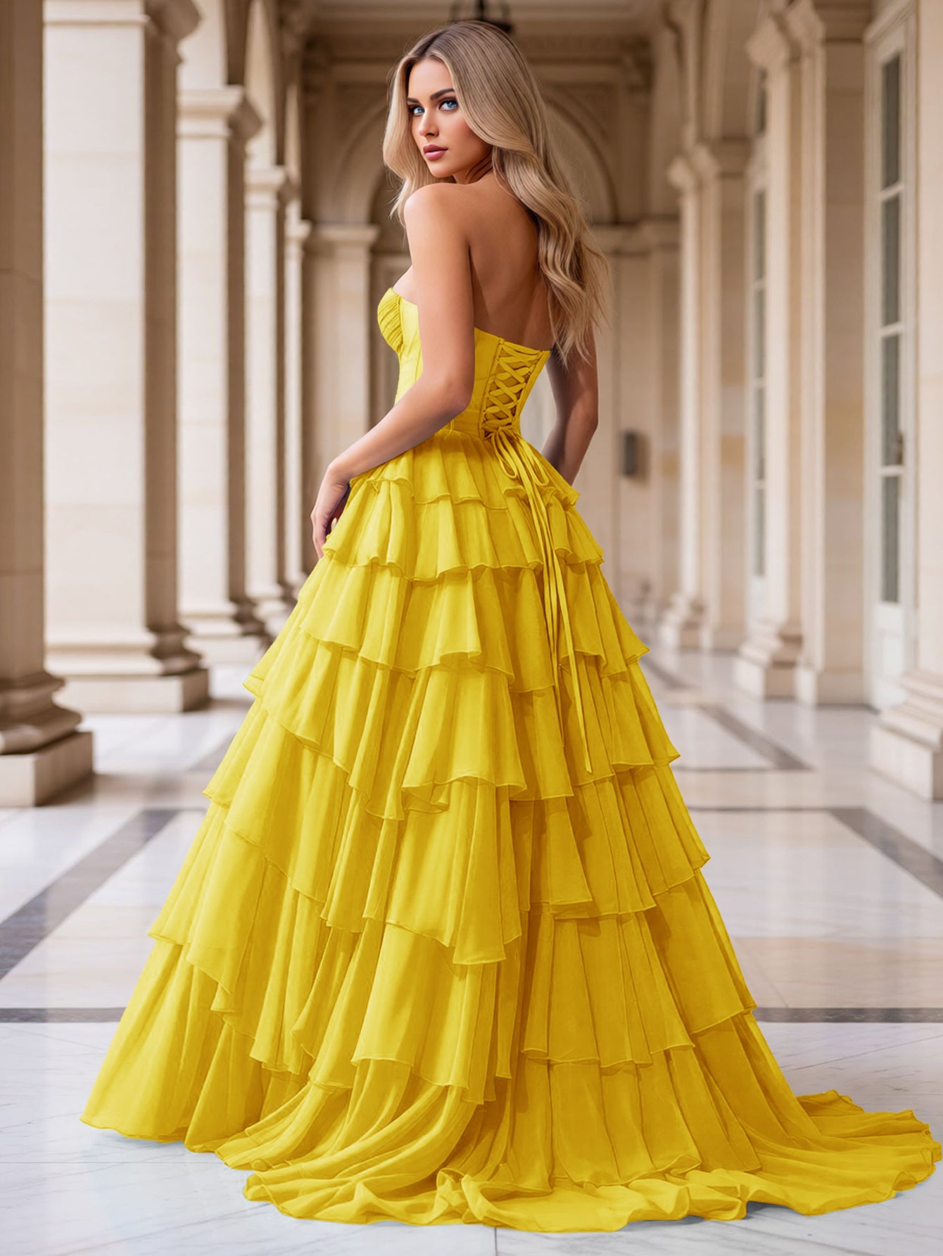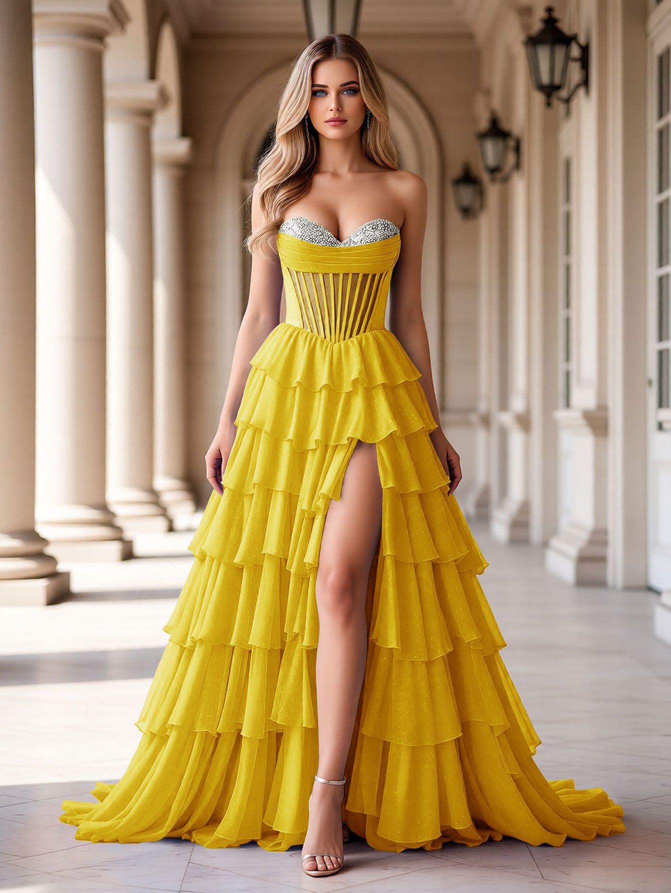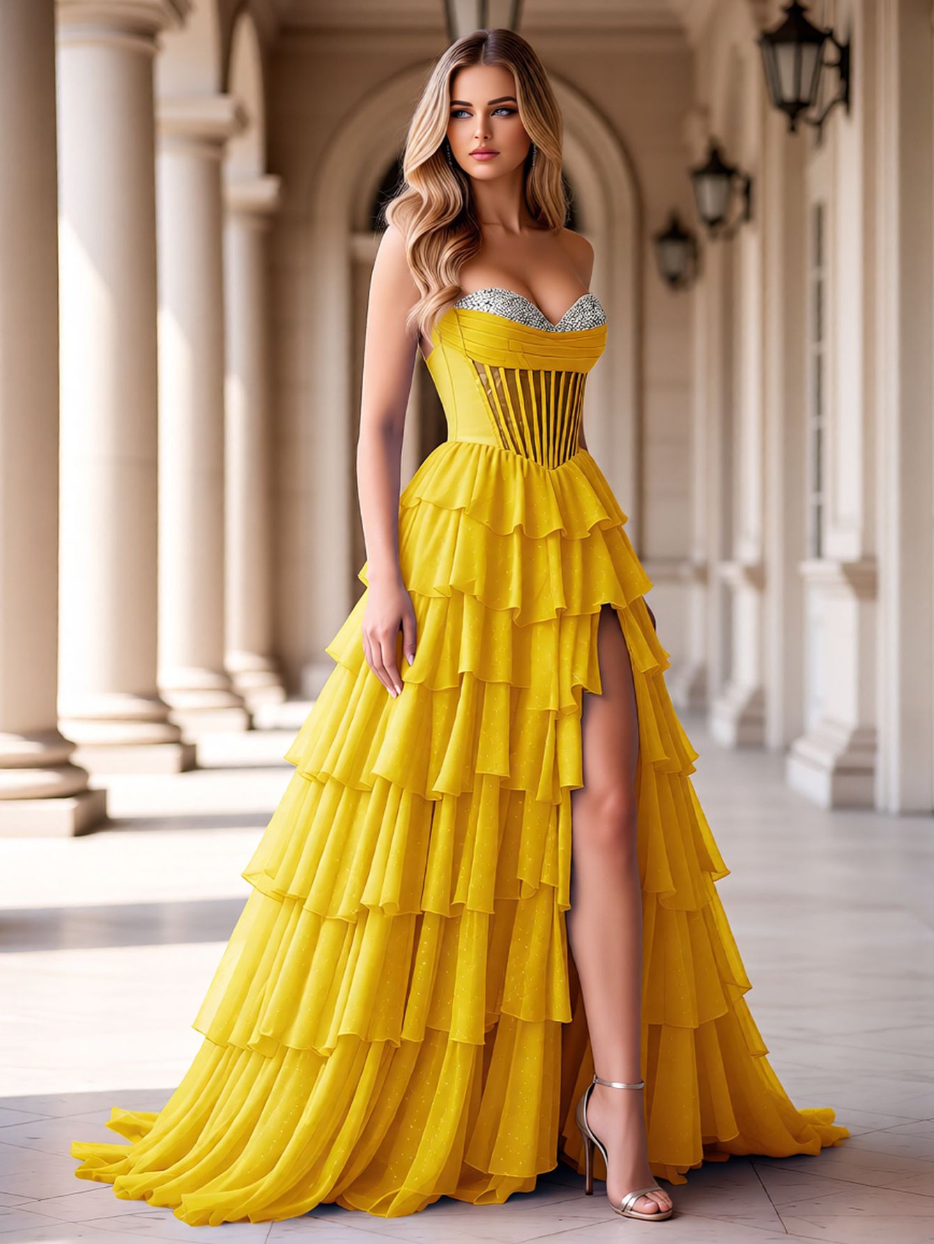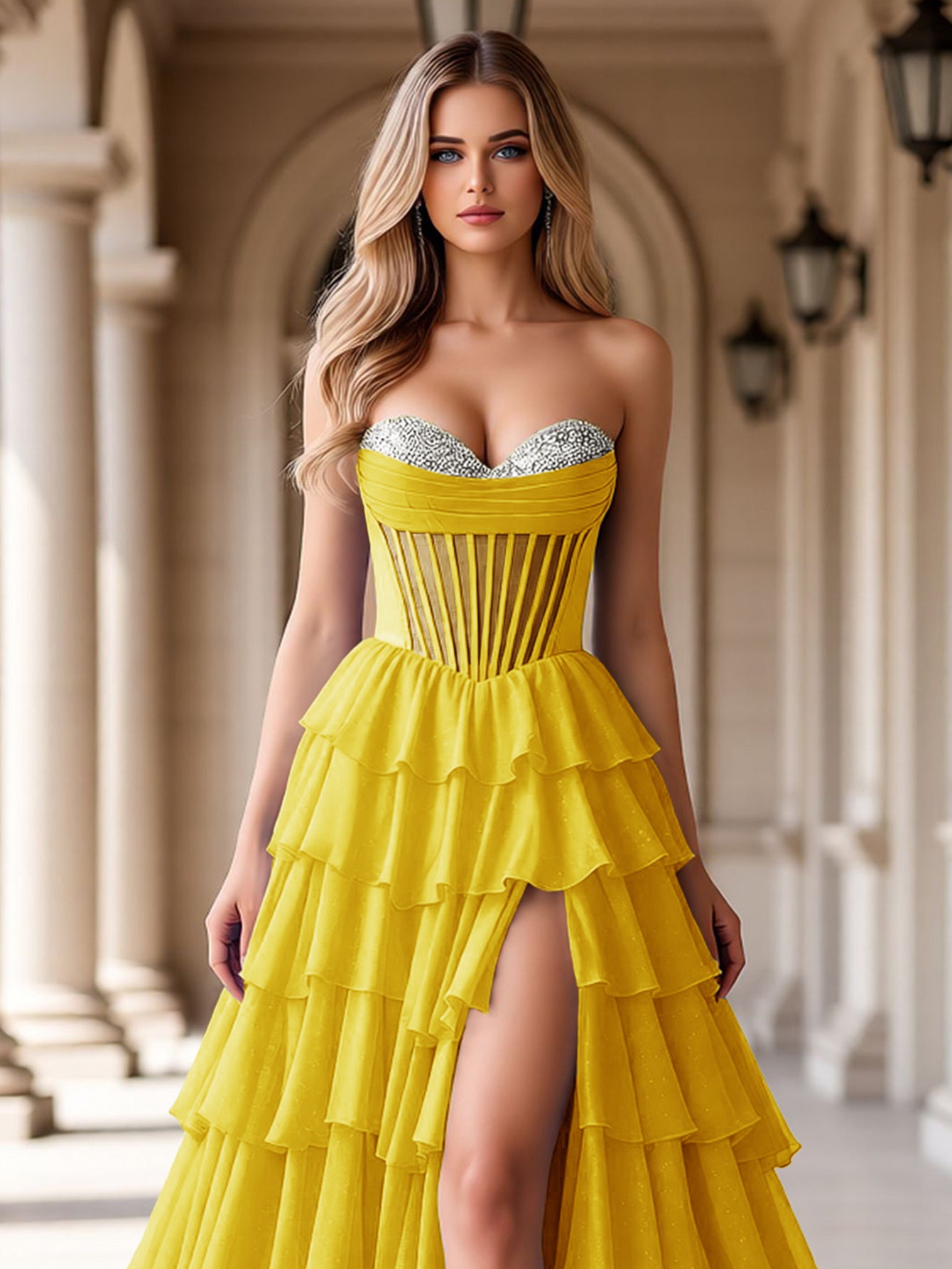 Strapless Corset Ball Gown With Ruffle Skirt Slit - Mustard Yellow