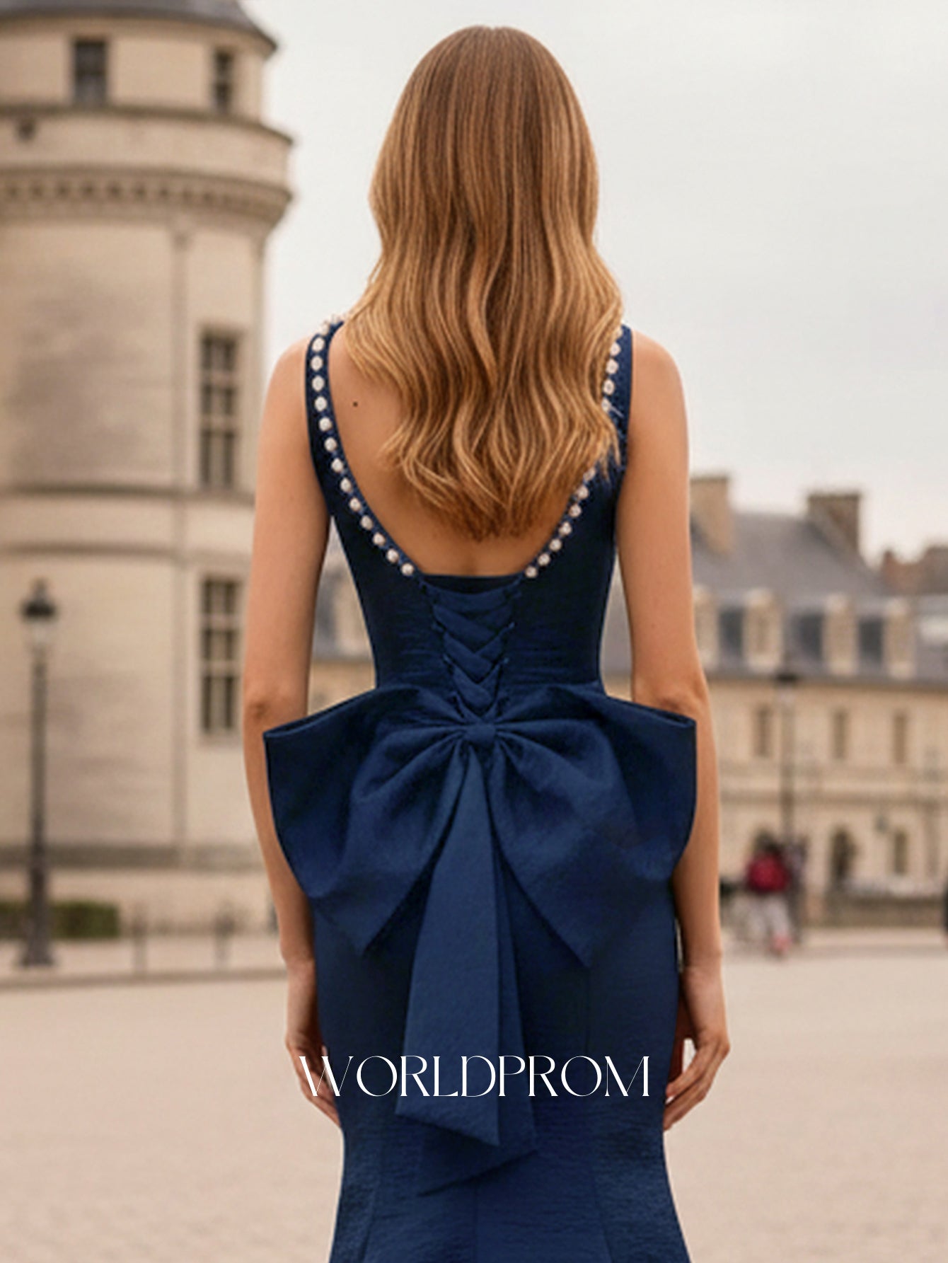 This satin prom gown features big bow back and beading on the bodice. The backless dress has a square neckline and sheath hem. Worldprom mermaid prom dresses are ideal for party, evening or festivals.