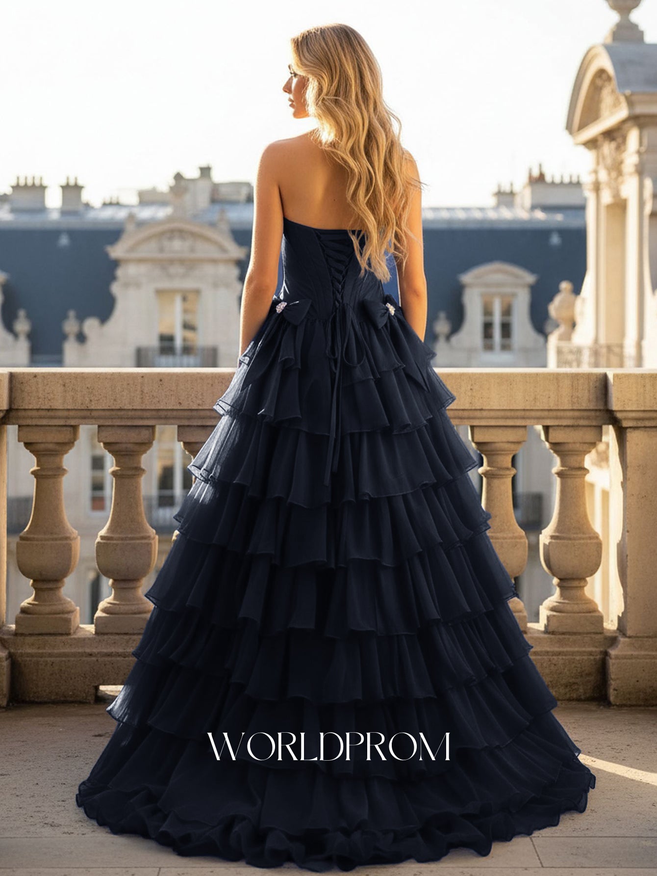 Details: Backless, Fitted Waist, Tiered, Boned, Bow