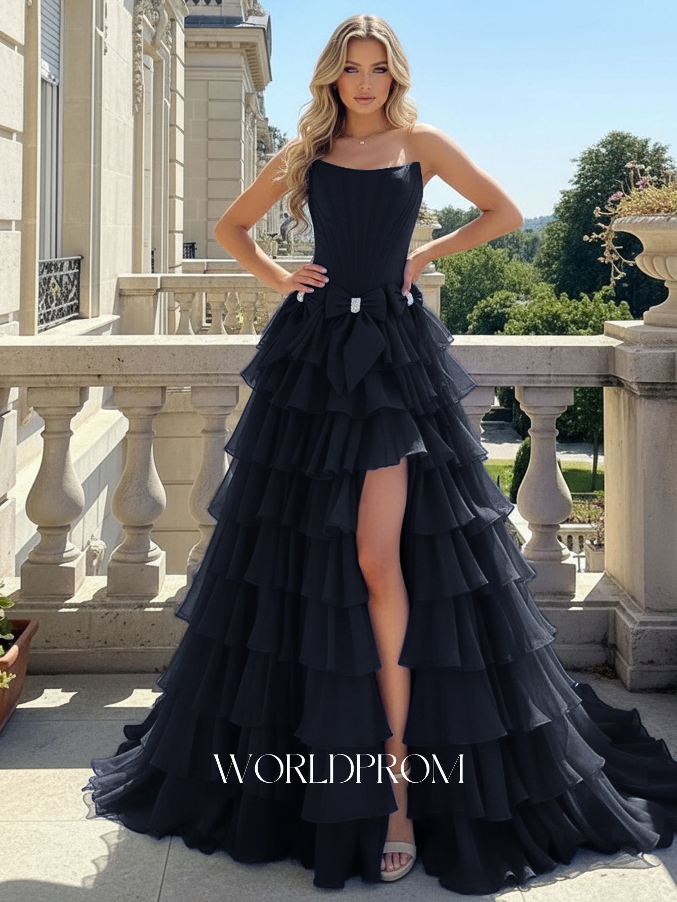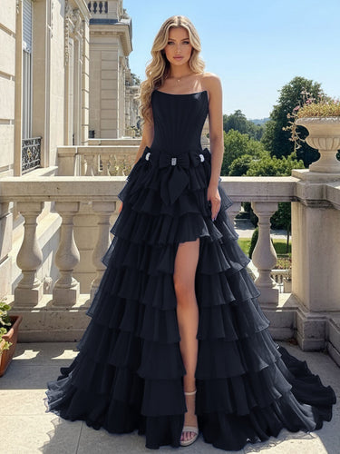 This chiffon long prom gown features bow bust on the bodice. The strapless maxi dress has a scoop neck and layered hem. This ball gown formal dress is ideal for party, evening or festivals.