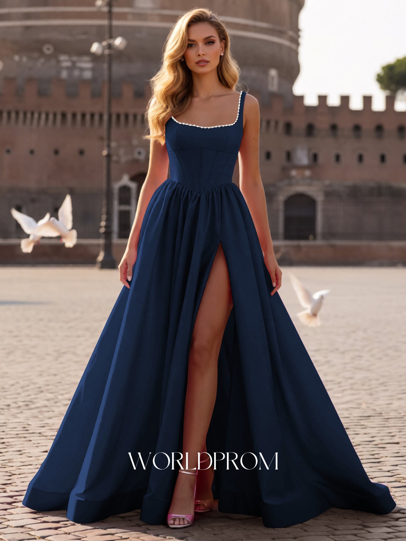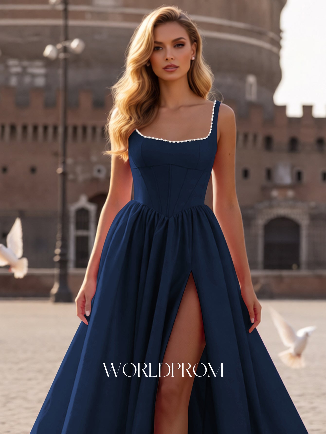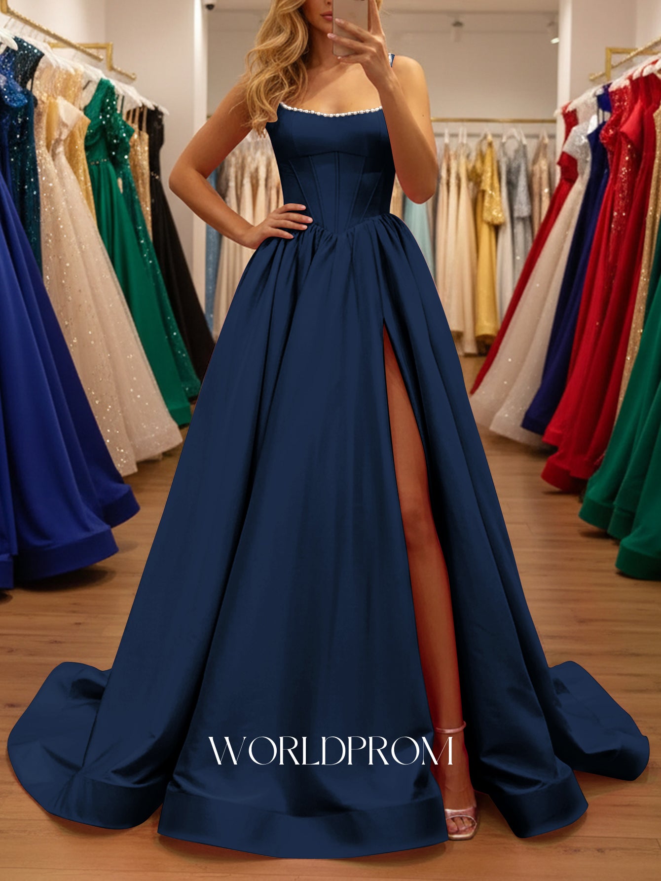 This satin prom gown features corset with pearls like on the bodice. The lace up dress has a square neckline and split hem. Worldprom ball gown prom dresses are ideal for party, evening or festivals.
