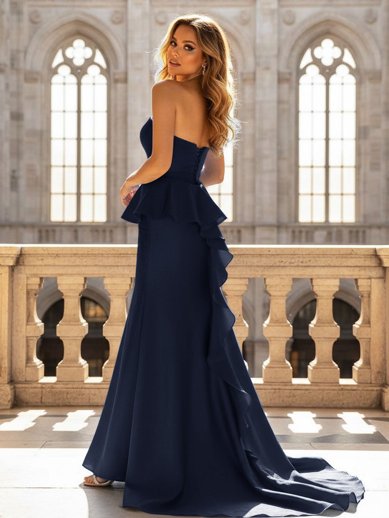 Details: Backless, Fitted Waist, Waist Drop, Split, Ruffle