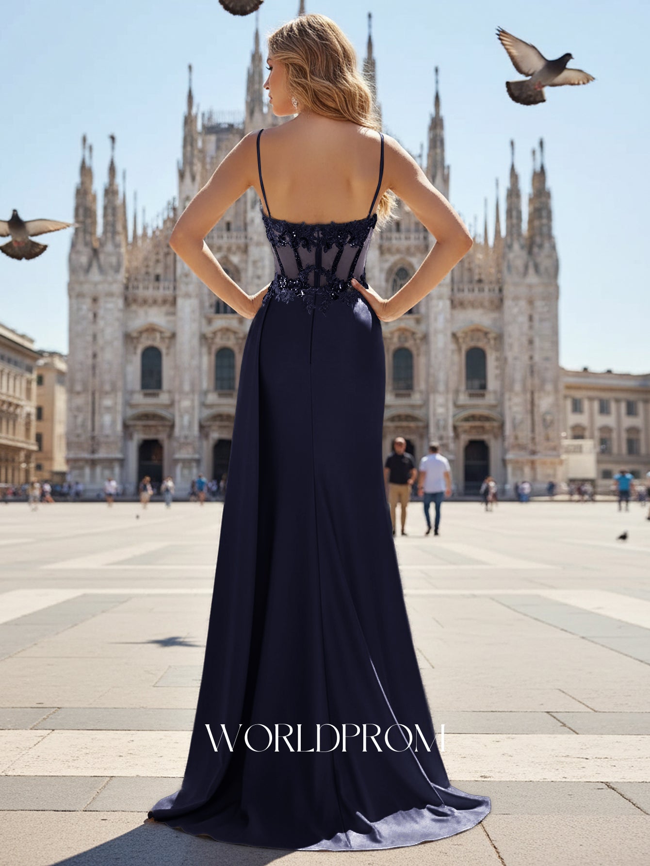 Sparkly Beading Illusion Spaghetti Shoulder Straps Mermaid Long Prom Dress - Navy Blue