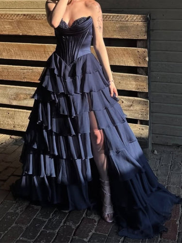 Strapless Boned Bodice Ruffle Chiffon Ball Gown Prom Dress - Navy Blue