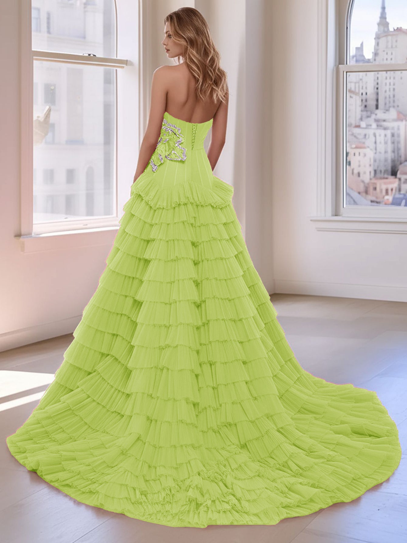 3D Rose Waist Strapless Tiered Ball Gown Evening Dress - Fluorescent