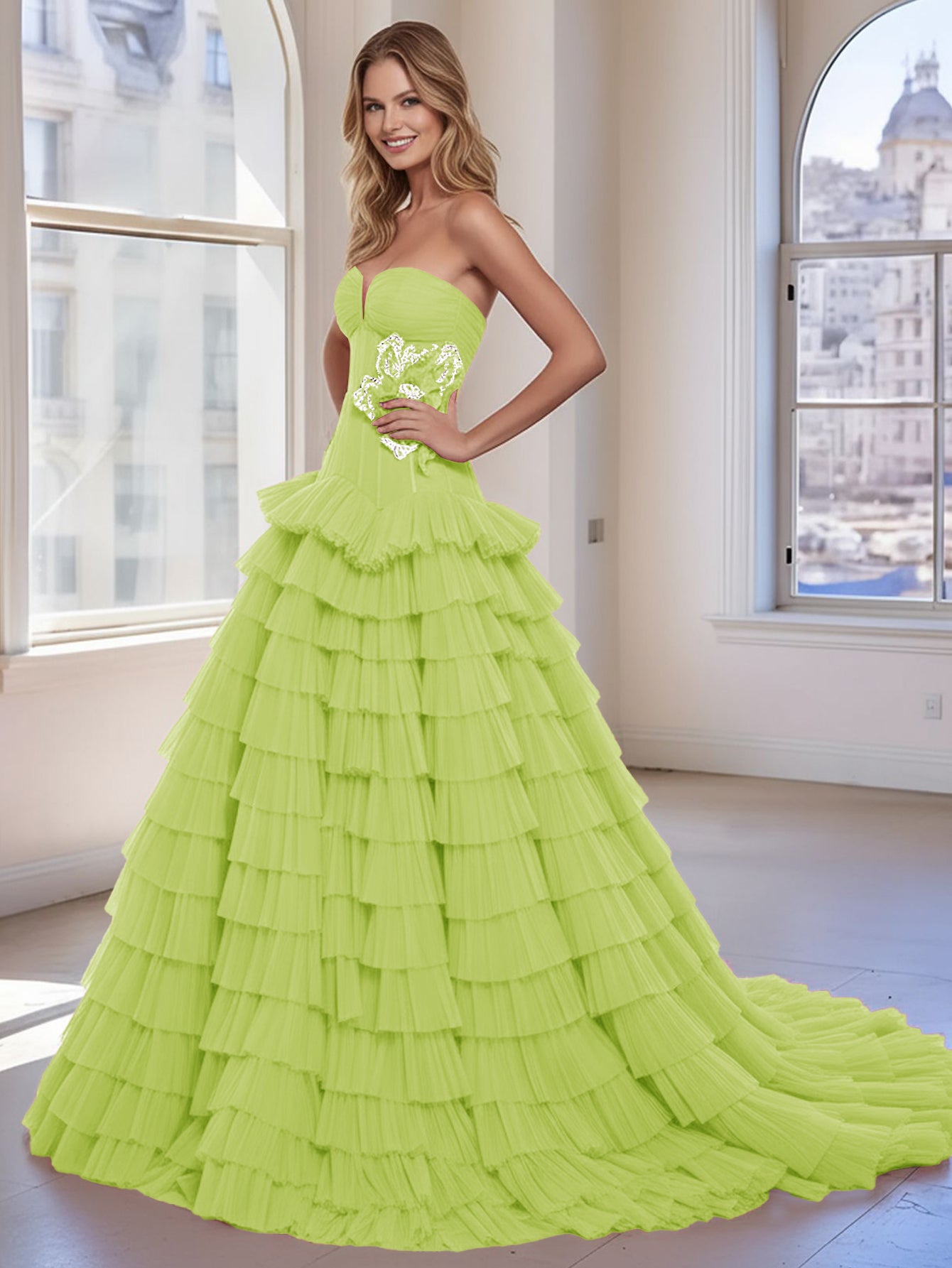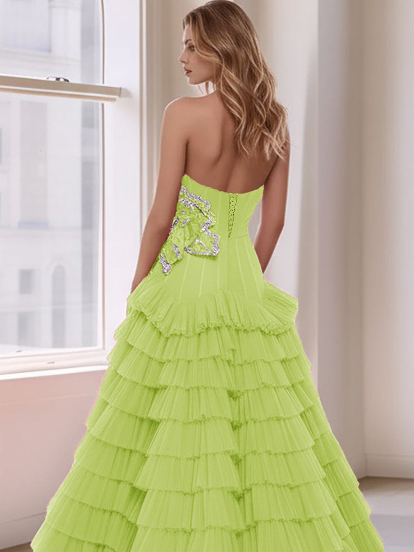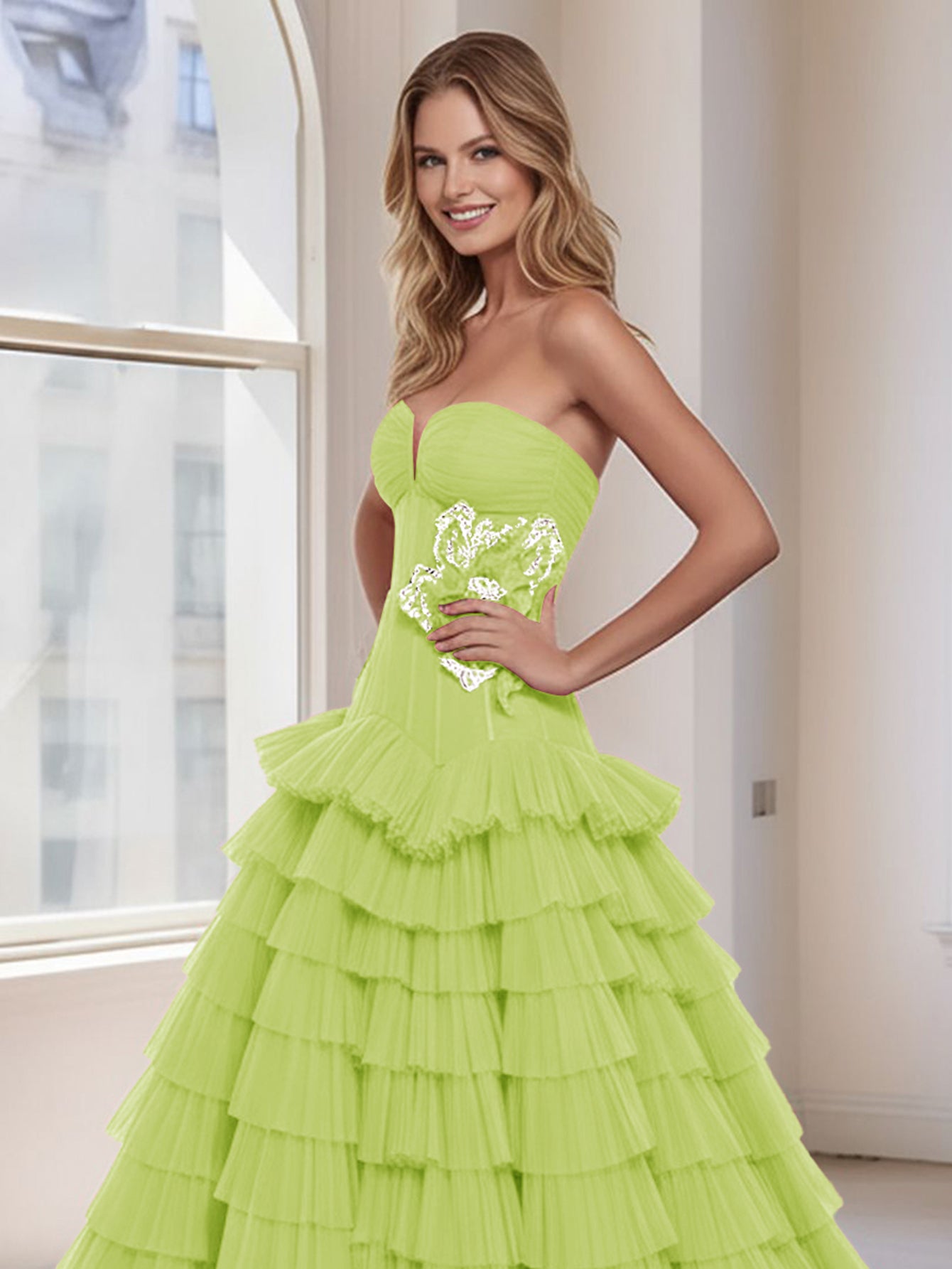 This fluorescent evening ball gown features tulle with 3d rose on the bodice. The strapless prom gown has a sweetheart neck and layered ruffle hem. This luxury dubai evening gown is ideal for party, evening or homecoming events.