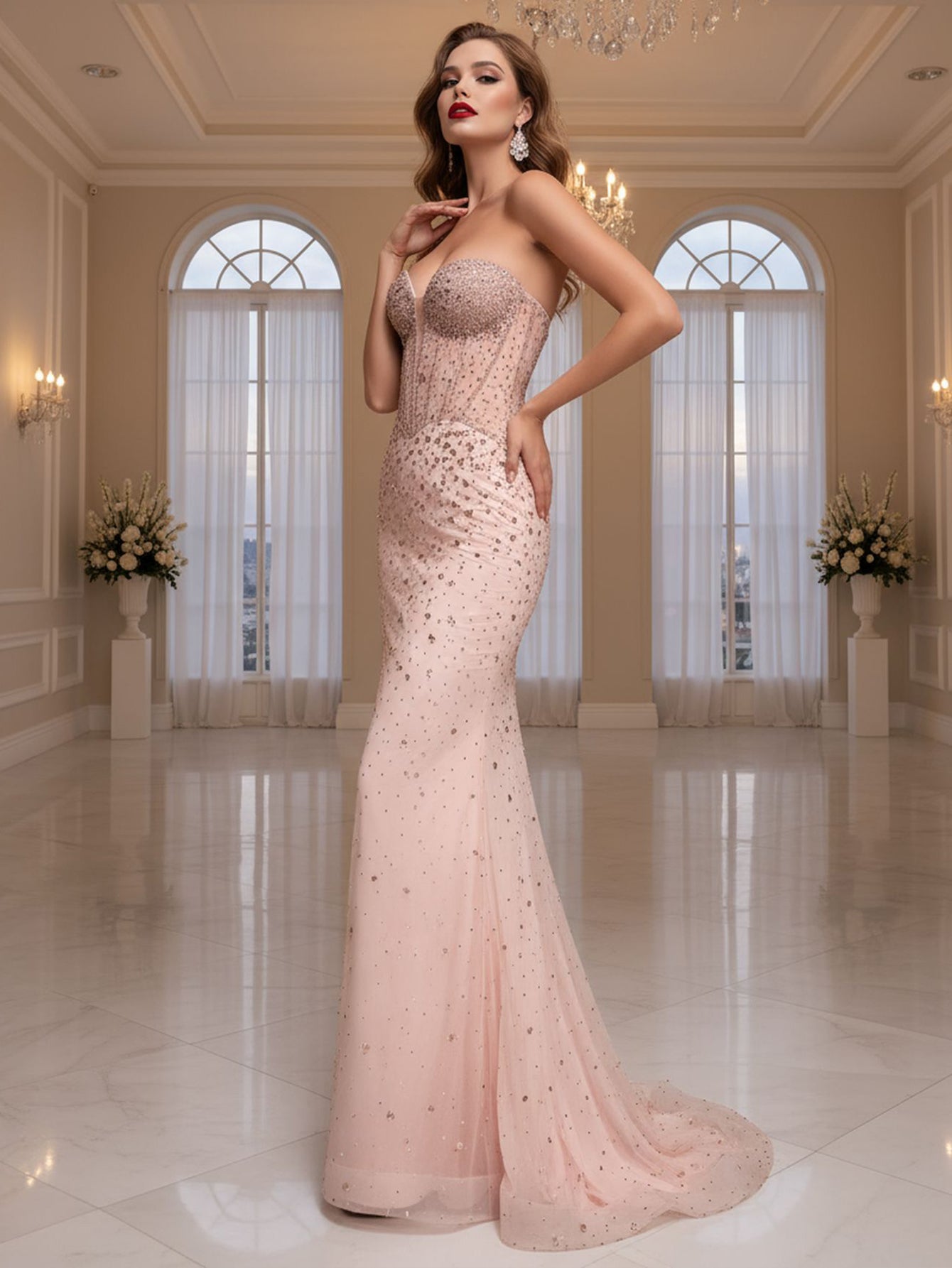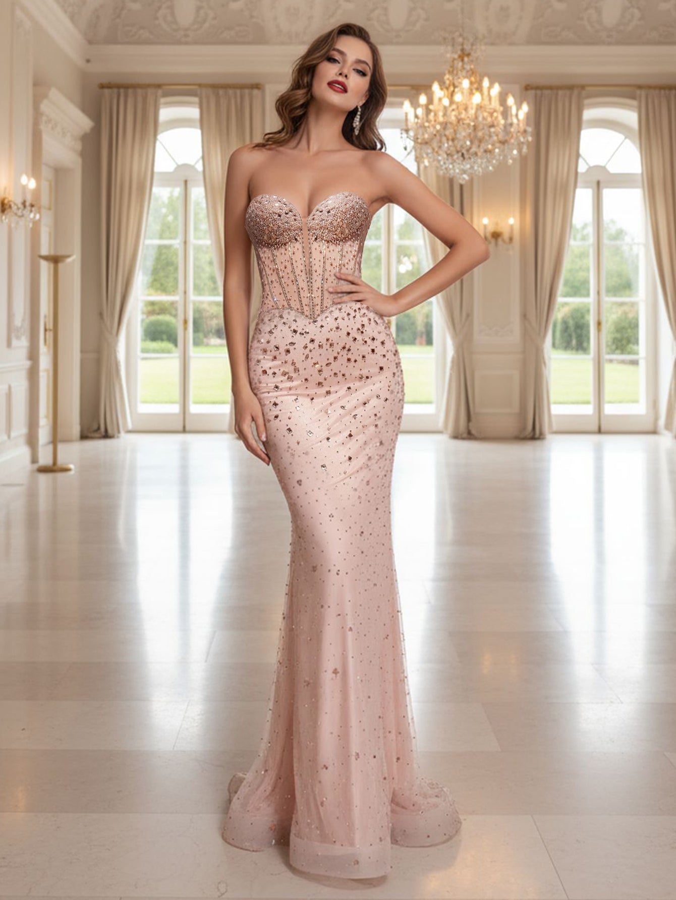 Sparkly Strapless Hand Beading Lace Up Bodice Mermaid Prom Dress - Champagne
