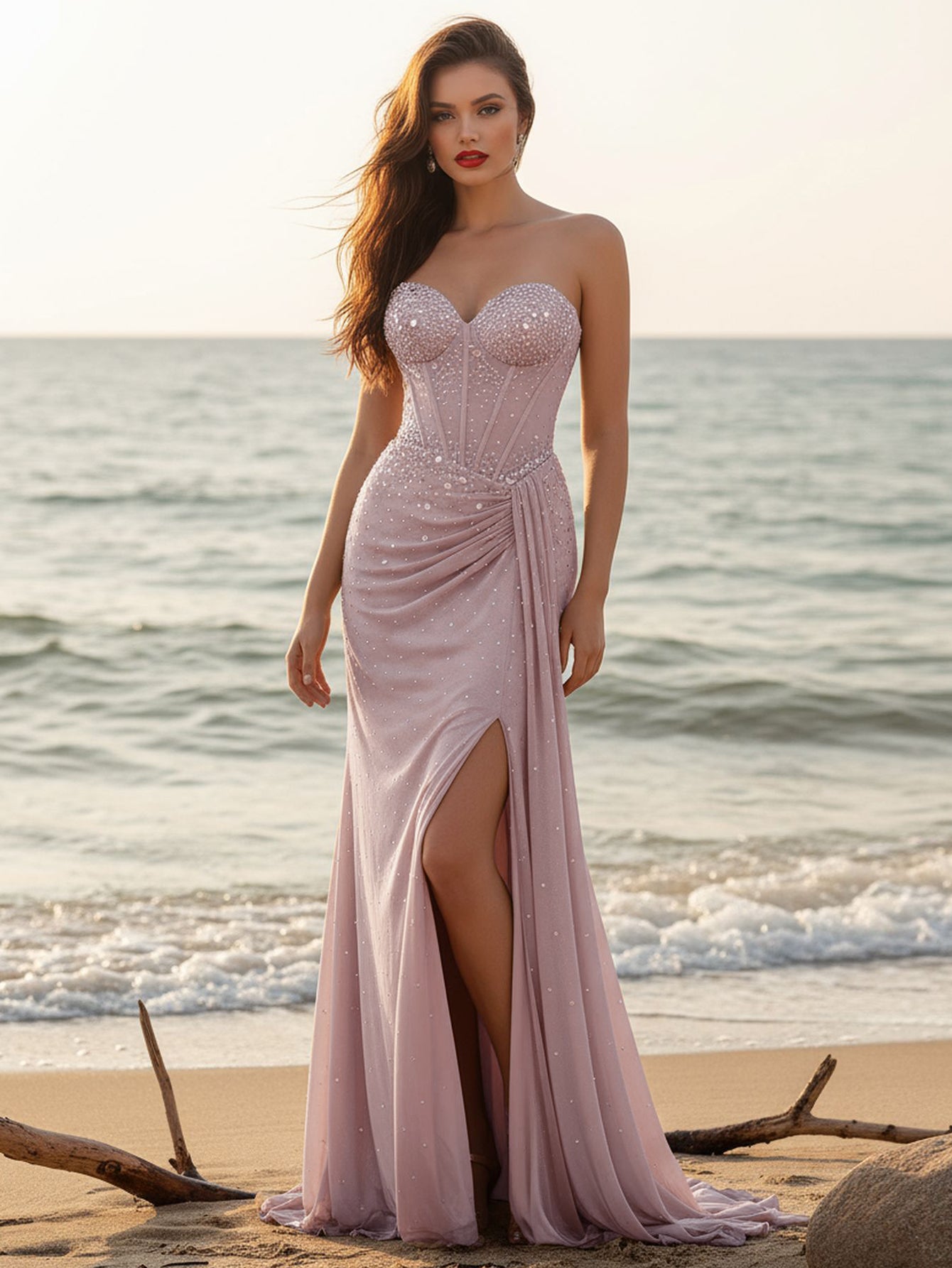 Strapless Beading Ruched Illusion Bodice Mermaid Prom Dress With Drop - Light Pink
